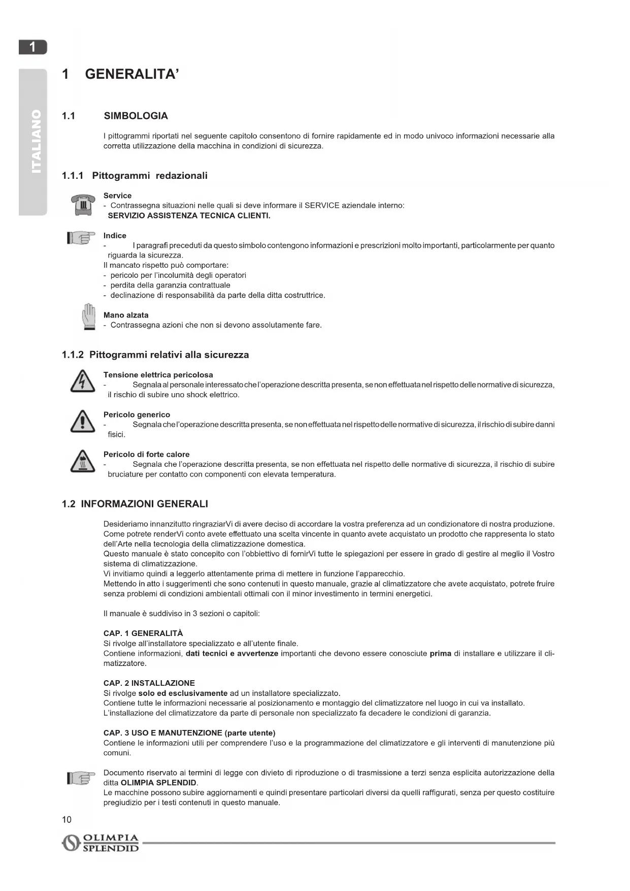 Desideriamo innanzitutto ringraziarVi di avere deciso di accordare la vostra preferenza ad un condizionatore di nostra produzione. Come potrete renderVi conto avete effettuato una scelta vincente in quanto avete acquistato un prodotto che rappresenta lo stato dell’Arte nella tecnologia della climatizzazione domestica. Questo manuale è stato concepito con l’obbiettivo di fornirVi tutte le spiegazioni per essere in grado di gestire al meglio il Vostro sistema di climatizzazione. Vi invitiamo quindi a leggerlo attentamente prima di mettere in funzione l’apparecchio. Mettendo in atto i suggerimenti che sono contenuti in questo manuale, grazie al climatizzatore che avete acquistato, potrete fruire senza problemi di condizioni ambientali ottimali con il minor investimento in termini energetici. Il manuale è suddiviso in 3 sezioni o capitoli: CAP. 1 GENERALITÀ Si rivolge all’installatore specializzato e all’utente nale. Contiene informazioni, dati tecnici e avvertenze importanti che devono essere conosciute prima di installare e utilizzare il cli- matizzatore. CAP. 2 INSTALLAZIONE Si rivolge solo ed esclusivamente ad un installatore specializzato. Contiene tutte le informazioni necessarie al posizionamento e montaggio del climatizzatore nel luogo in cui va installato. L’installazione del climatizzatore da parte di personale non specializzato fa decadere le condizioni di garanzia. CAP. 3 USO E MANUTENZIONE (parte utente) Contiene le informazioni utili per comprendere l’uso e la programmazione del climatizzatore e gli interventi di manutenzione più comuni. Documento riservato ai termini di legge con divieto di riproduzione o di trasmissione a terzi senza esplicita autorizzazione della ditta OLIMPIA SPLENDID. Le macchine possono subire aggiornamenti e quindi presentare particolari diversi da quelli rafgurati, senza per questo costituire pregiudizio per i testi contenuti in questo manuale.11 ITALIANO