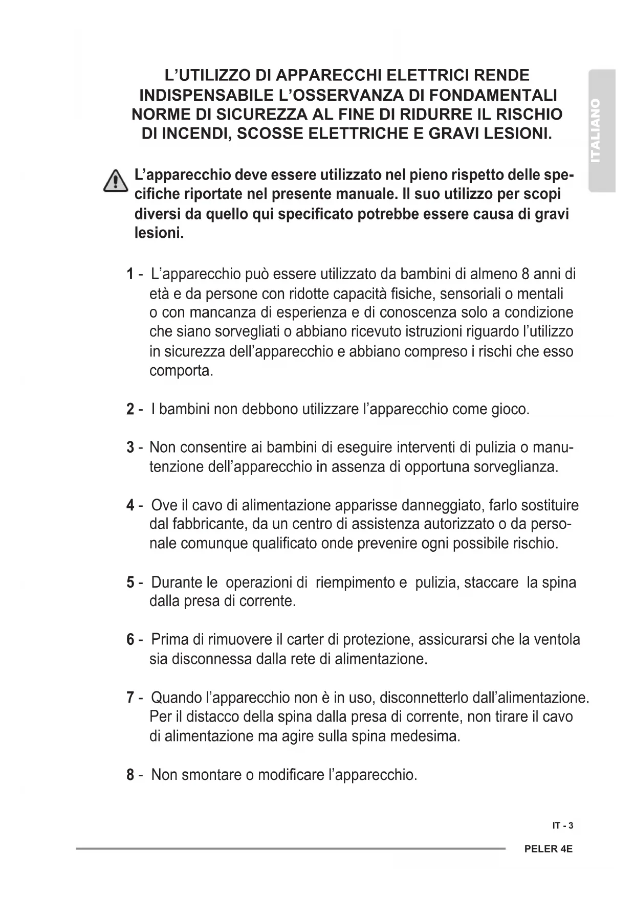 NORME DI SICUREZZA AL FINE DI RIDURRE IL RISCHIO DI INCENDI, SCOSSE ELETTRICHE E GRAVI LESIONI. L’apparecchio deve essere utilizzato nel pieno rispetto delle spe- ciche riportate nel presente manuale. Il suo utilizzo per scopi diversi da quello qui specicato potrebbe essere causa di gravi lesioni.
