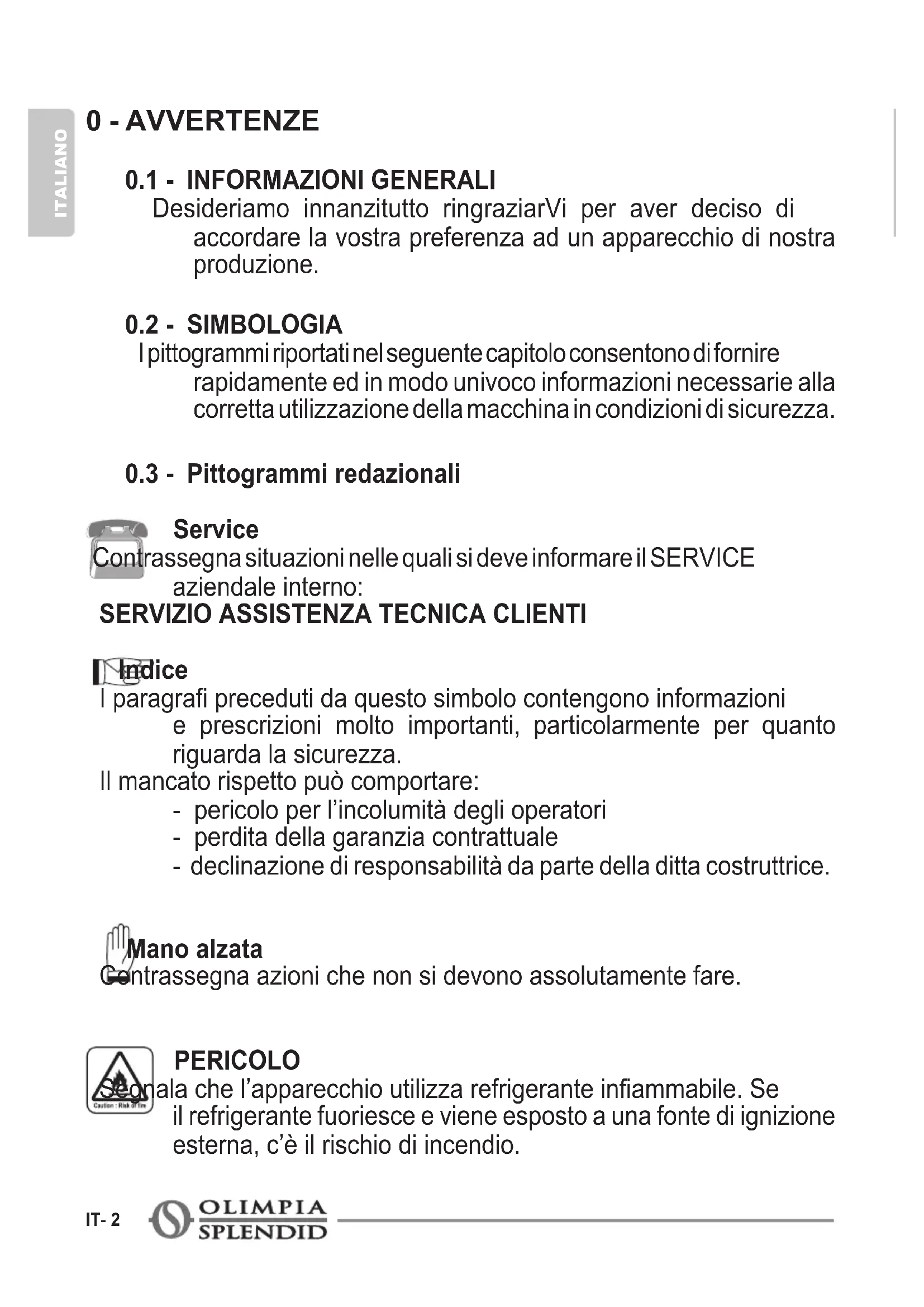 Indice I paragra preceduti da questo simbolo contengono informazioni e prescrizioni molto importanti, particolarmente per quanto riguarda la sicurezza. Il mancato rispetto può comportare: - pericolo per l’incolumità degli operatori - perdita della garanzia contrattuale - declinazione di responsabilità da parte della ditta costruttrice. Mano alzata Contrassegna azioni che non si devono assolutamente fare. PERICOLO Segnala che l’apparecchio utilizza refrigerante inammabile. Se il refrigerante fuoriesce e viene esposto a una fonte di ignizione esterna, c’è il rischio di incendio.CALDORAD DIGITAL ITALIANO IT- 3