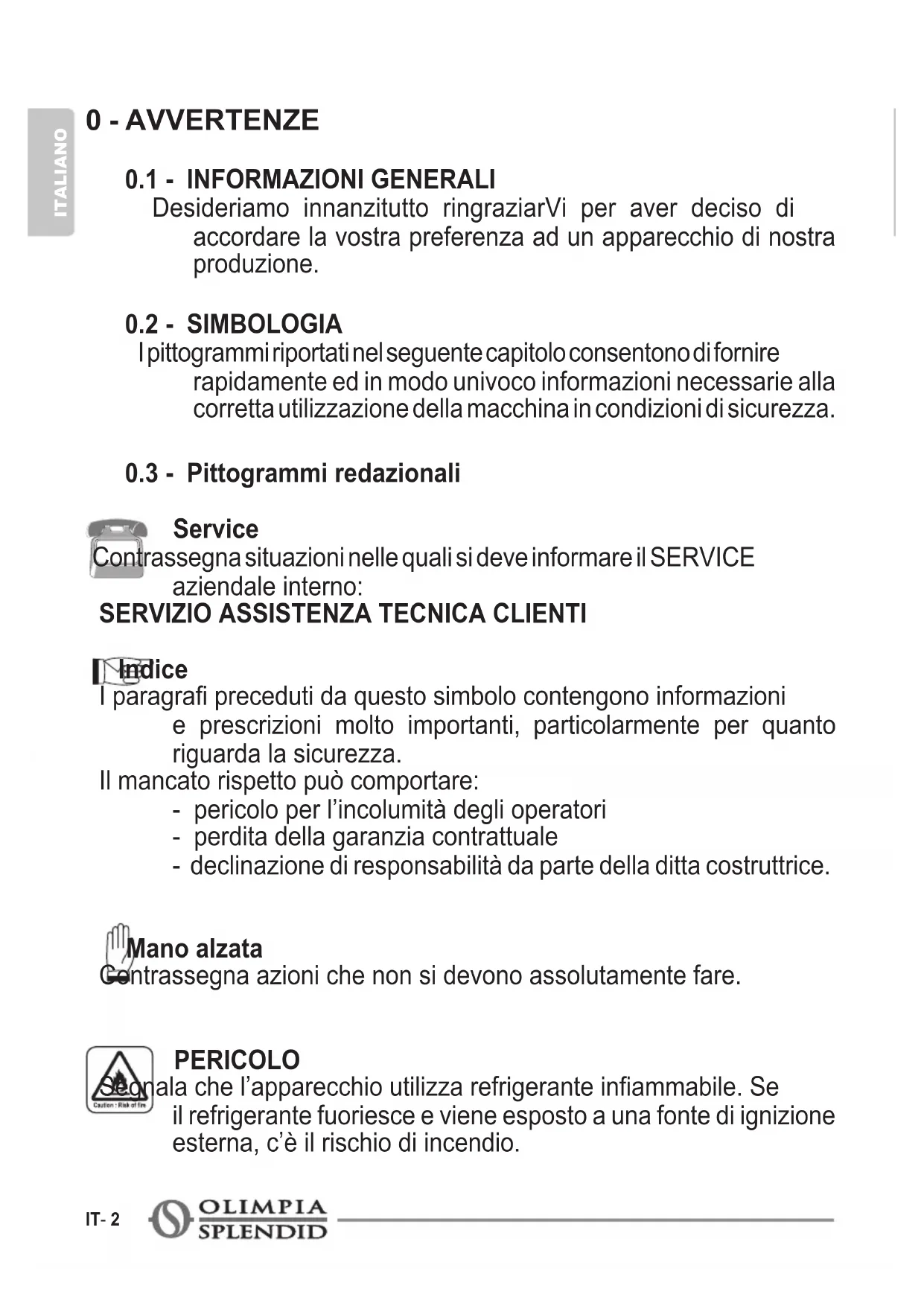 Indice I paragra preceduti da questo simbolo contengono informazioni e prescrizioni molto importanti, particolarmente per quanto riguarda la sicurezza. Il mancato rispetto può comportare: - pericolo per l’incolumità degli operatori - perdita della garanzia contrattuale - declinazione di responsabilità da parte della ditta costruttrice. Mano alzata Contrassegna azioni che non si devono assolutamente fare. PERICOLO Segnala che l’apparecchio utilizza refrigerante inammabile. Se il refrigerante fuoriesce e viene esposto a una fonte di ignizione esterna, c’è il rischio di incendio.CALDOSILENT ITALIANO IT- 3