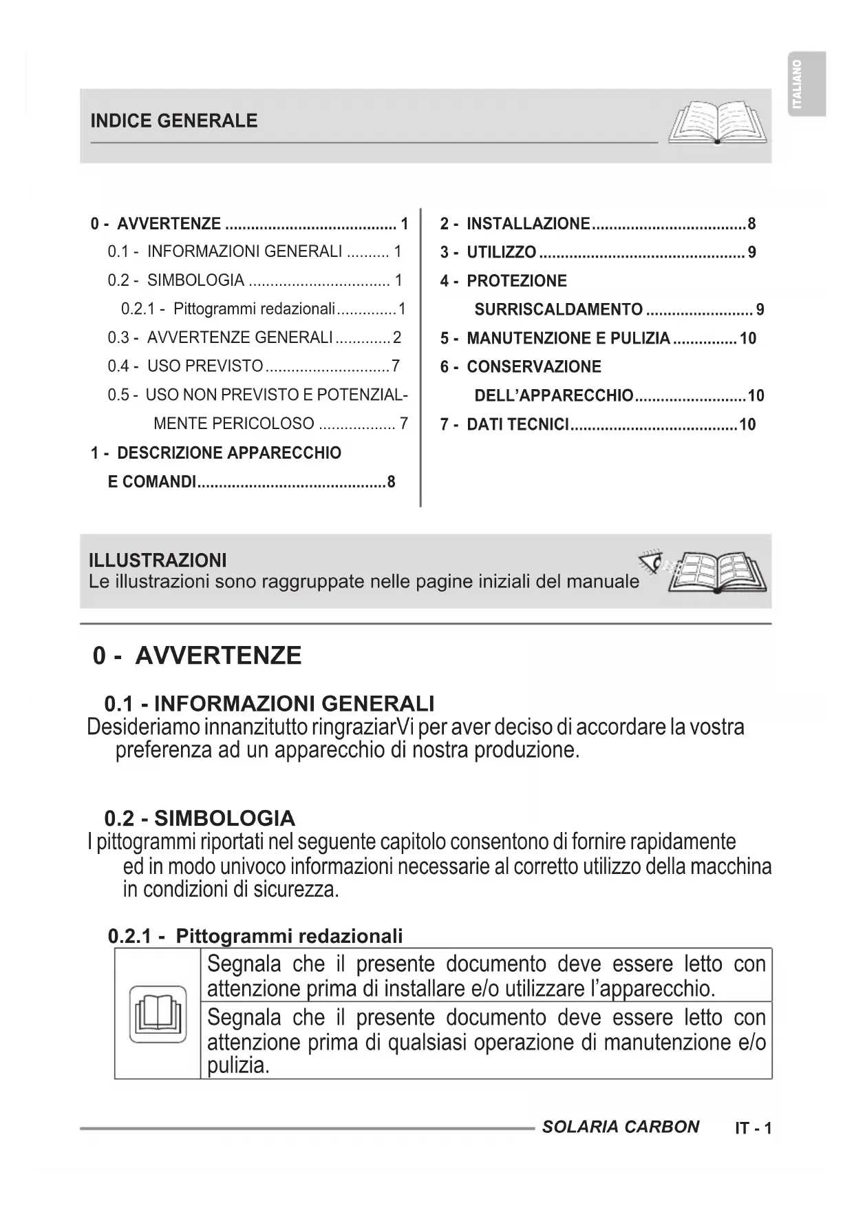 - Vedere la tabella presente nelle ultime pagine del manuale.SOLARIA CARBONEN - 1ENGLISH MAIN INDEX
