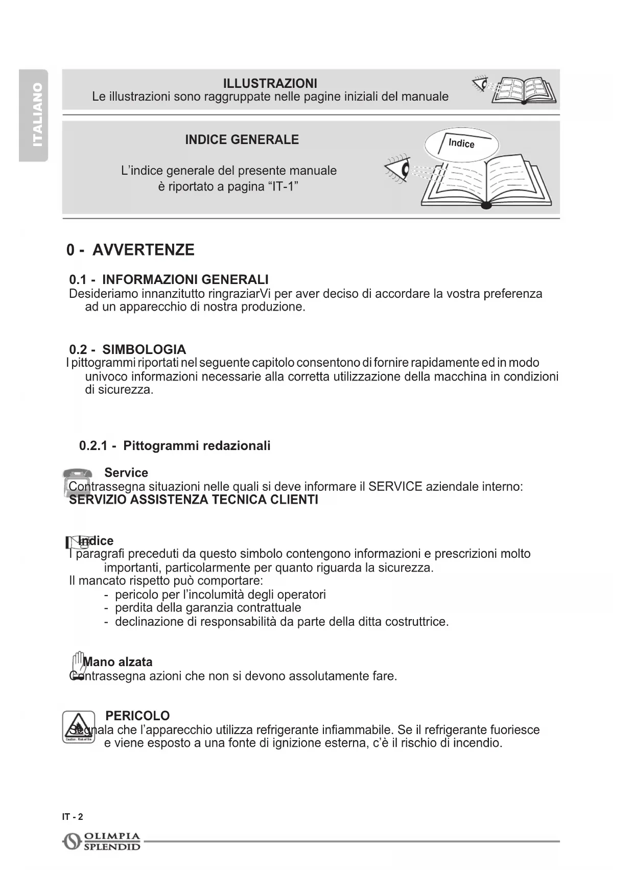 Indice I paragra preceduti da questo simbolo contengono informazioni e prescrizioni molto importanti, particolarmente per quanto riguarda la sicurezza. Il mancato rispetto può comportare: - pericolo per l’incolumità degli operatori - perdita della garanzia contrattuale - declinazione di responsabilità da parte della ditta costruttrice. Mano alzata Contrassegna azioni che non si devono assolutamente fare. PERICOLO Segnala che l’apparecchio utilizza refrigerante inammabile. Se il refrigerante fuoriesce e viene esposto a una fonte di ignizione esterna, c’è il rischio di incendio. Indice INDICE GENERALE L’indice generale del presente manuale è riportato a pagina “IT-1” ILLUSTRAZIONI Le illustrazioni sono raggruppate nelle pagine iniziali del manualeAQUARIA SLIM IT - 3 ITALIANO