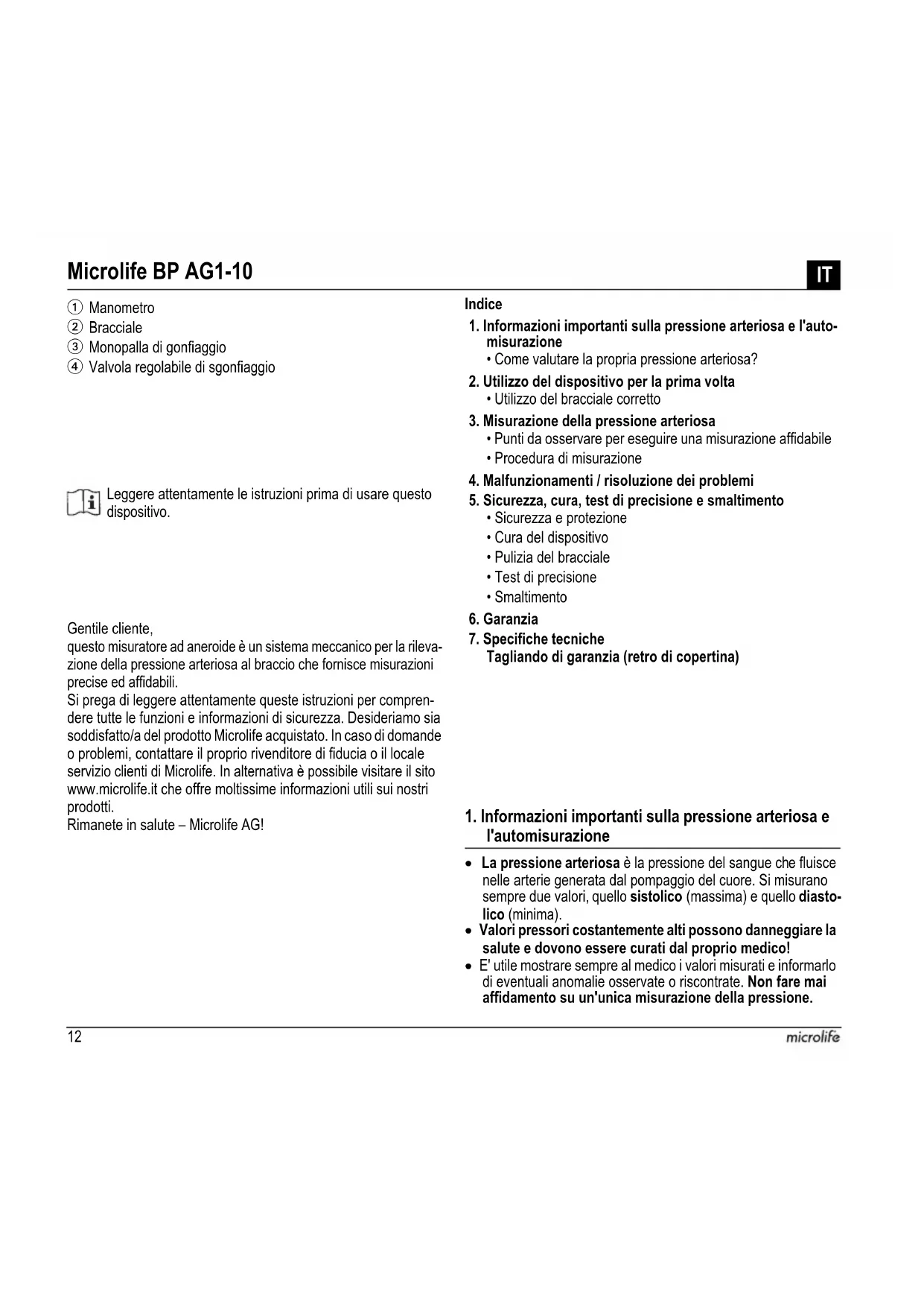 Cet appareil est conforme aux exigences de la directive relative aux appareils médicaux 93/42/EEC. Sous réserve de modifications techniques. Poids: 360 g Dimensions: 175 x 70 x 103 mm Conditions de stockage: -20 - +70 °C Humidité relative 30 - 85 % max. Conditions d’utilisation: 0 - 46 °C Plage de mesure: 0 - 300 mmHg Résolution: 2 mmHg Précision statique: entre ± 3 mmHg et 18 - 33 °C; entre ± 6 mmHg et 34 - 46 °C Fuite d’air: < ± 4 mmHg/min Erreur d’hystérésis: de 0 à 4 mmHg Accessoires inclus: brassard (25 - 40 cm), poire, valve, trousse souple Référence aux normes: EN ISO 81060-1; ANSI / AAMI SP0911BP AG1-10 FR12 Leggere attentamente le istruzioni prima di usare questo dispositivo. Gentile cliente, questo misuratore ad aneroide è un sistema meccanico per la rileva- zione della pressione arteriosa al braccio che fornisce misurazioni precise ed affidabili. Si prega di leggere attentamente queste istruzioni per compren- dere tutte le funzioni e informazioni di sicurezza. Desideriamo sia soddisfatto/a del prodotto Microlife acquistato. In caso di domande o problemi, contattare il proprio rivenditore di fiducia o il locale servizio clienti di Microlife. In alternativa è possibile visitare il sito www.microlife.it che offre moltissime informazioni utili sui nostri prodotti. Rimanete in salute – Microlife AG! Indice