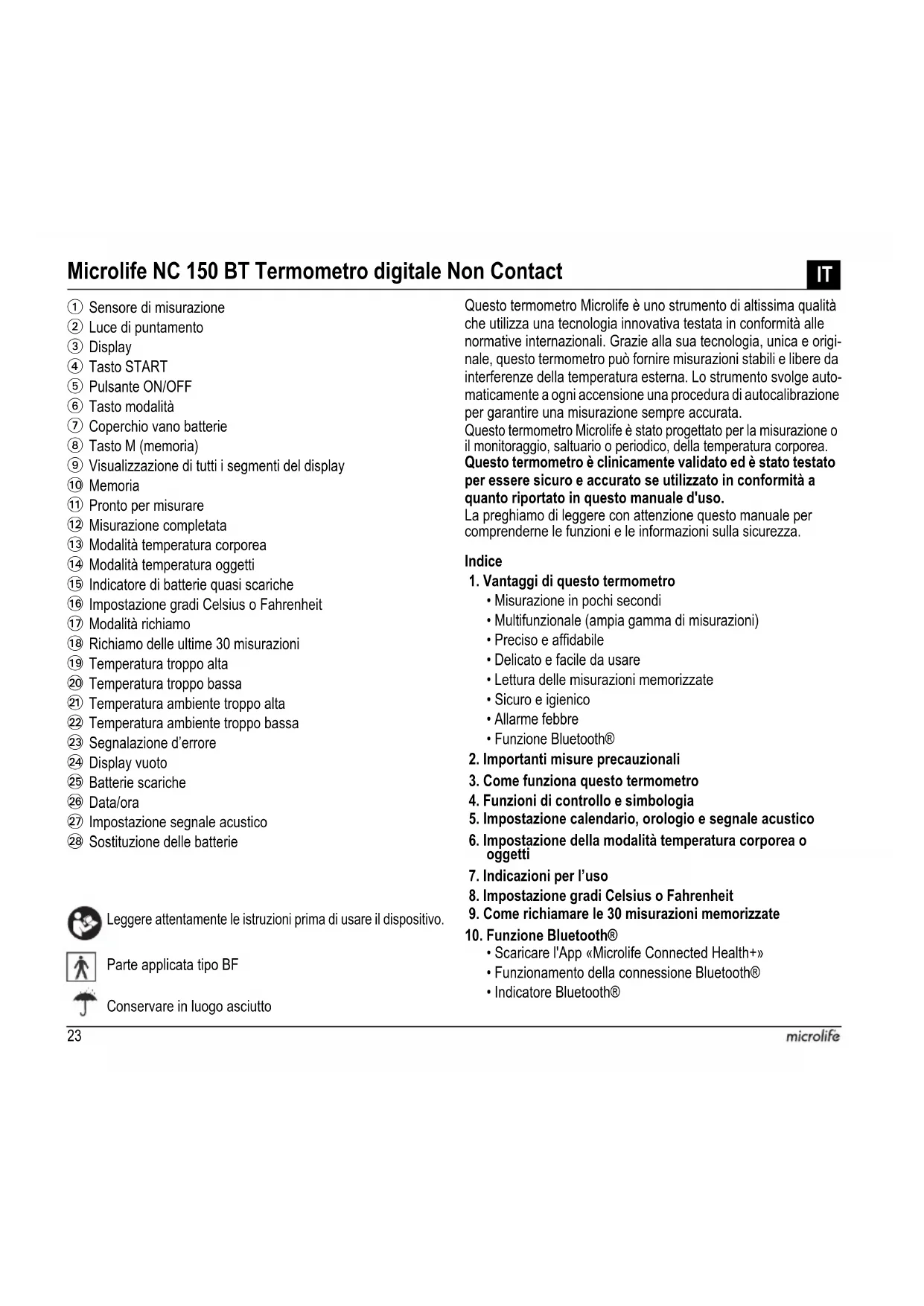 Durée de fonctionne- ment: 5 ans ou 12000 mesures22NC 150 BT FR23 Leggere attentamente le istruzioni prima di usare il dispositivo. Parte applicata tipo BF Questo termometro Microlife è uno strumento di altissima qualità che utilizza una tecnologia innovativa testata in conformità alle normative internazionali. Grazie alla sua tecnologia, unica e origi- nale, questo termometro può fornire misurazioni stabili e libere da interferenze della temperatura esterna. Lo strumento svolge auto- maticamente a ogni accensione una procedura di autocalibrazione per garantire una misurazione sempre accurata. Questo termometro Microlife è stato progettato per la misurazione o il monitoraggio, saltuario o periodico, della temperatura corporea. Questo termometro è clinicamente validato ed è stato testato per essere sicuro e accurato se utilizzato in conformità a quanto riportato in questo manuale d'uso. La preghiamo di leggere con attenzione questo manuale per comprenderne le funzioni e le informazioni sulla sicurezza. Indice