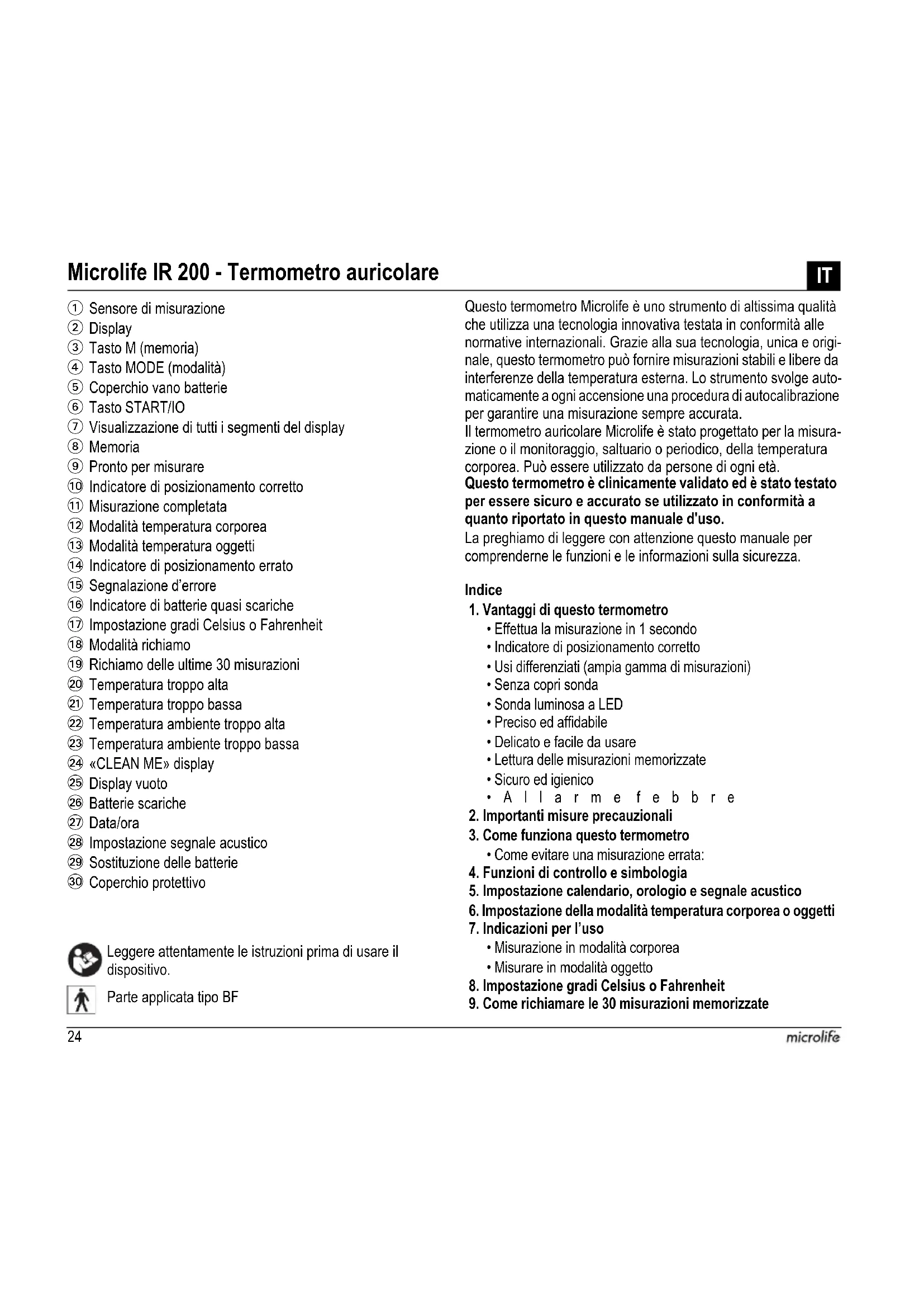 Humidité relative 15 - 95 % max. Conditions de stockage: -25 - +55 °C / -13 - +131 °F Humidité relative 15 - 95 % max. Arrêt automatique: 1 minute environ après la fin de la mesure. Pile: 1 x CR2032 pile 3V Durée de vie des piles: env. 1000 mesures (avec une pile neuve) Dimensions: 150 x 43 x 60 mm22 Cet appareil est conforme aux exigences de la directive relative aux appareils médicaux 93/42/EEC. Sous réserve de modifications techniques. D'après le Medical Product User Act, une vérification tous les deux ans est recommandée pour les professionnels. Se conformer à la réglementation en vigueur sur la mise au rebut. 15.www.microlife.fr Des informations détaillées sur l'utilisation de nos thermomètres et de nos tensiomètres ainsi que sur nos services sont disponibles sur www.microlife.fr. Poids: 60 g (avec pile), 58 g (sans pile) Classe IP: IP22 Référence aux normes: EN 12470-5; ASTM E1965; IEC 60601-1; IEC 60601-1-2 (EMC); IEC 60601-1-11 Espérance de fonctionnement: 5 ans ou 12000 mesures23IR 200 FR24 Leggere attentamente le istruzioni prima di usare il dispositivo. Parte applicata tipo BF Questo termometro Microlife è uno strumento di altissima qualità che utilizza una tecnologia innovativa testata in conformità alle normative internazionali. Grazie alla sua tecnologia, unica e origi- nale, questo termometro può fornire misurazioni stabili e libere da interferenze della temperatura esterna. Lo strumento svolge auto- maticamente a ogni accensione una procedura di autocalibrazione per garantire una misurazione sempre accurata. Il termometro auricolare Microlife è stato progettato per la misura- zione o il monitoraggio, saltuario o periodico, della temperatura corporea. Può essere utilizzato da persone di ogni età. Questo termometro è clinicamente validato ed è stato testato per essere sicuro e accurato se utilizzato in conformità a quanto riportato in questo manuale d'uso. La preghiamo di leggere con attenzione questo manuale per comprenderne le funzioni e le informazioni sulla sicurezza. Indice