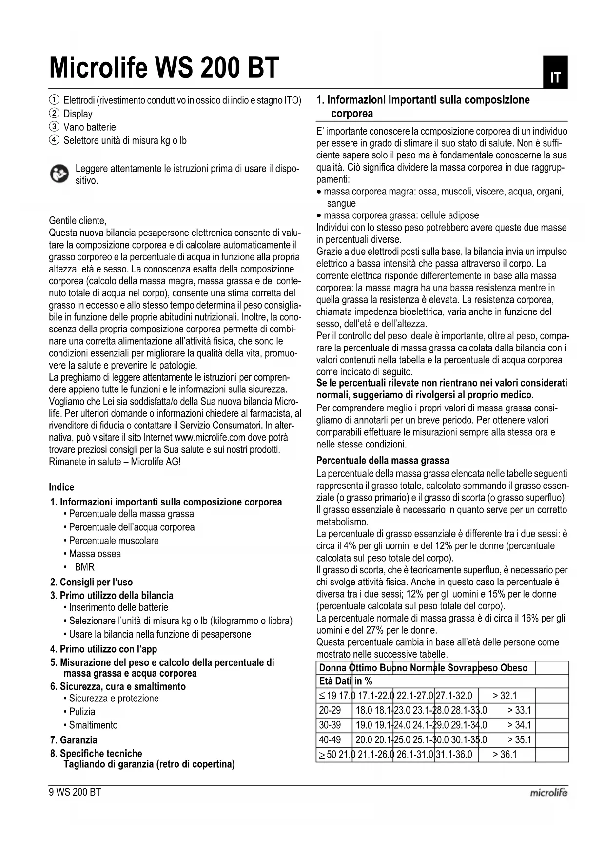 sont des marques déposées appartenant à Bluetooth SIG, Inc. et toute utilisation de ces marques par Microlife Corp. est sous licence. Les autres marques et noms commerciaux sont ceux de leurs propriétaires respectifs.9 WS 200 BT Leggere attentamente le istruzioni prima di usare il dispo- sitivo. Gentile cliente, Questa nuova bilancia pesapersone elettronica consente di valu- tare la composizione corporea e di calcolare automaticamente il grasso corporeo e la percentuale di acqua in funzione alla propria altezza, età e sesso. La conoscenza esatta della composizione corporea (calcolo della massa magra, massa grassa e del conte- nuto totale di acqua nel corpo), consente una stima corretta del grasso in eccesso e allo stesso tempo determina il peso consiglia- bile in funzione delle proprie abitudini nutrizionali. Inoltre, la cono- scenza della propria composizione corporea permette di combi- nare una corretta alimentazione all’attività fisica, che sono le condizioni essenziali per migliorare la qualità della vita, promuo- vere la salute e prevenire le patologie. La preghiamo di leggere attentamente le istruzioni per compren- dere appieno tutte le funzioni e le informazioni sulla sicurezza. Vogliamo che Lei sia soddisfatta/o della Sua nuova bilancia Micro- life. Per ulteriori domande o informazioni chiedere al farmacista, al rivenditore di fiducia o contattare il Servizio Consumatori. In alter- nativa, può visitare il sito Internet www.microlife.com dove potrà trovare preziosi consigli per la Sua salute e sui nostri prodotti. Rimanete in salute – Microlife AG! Indice