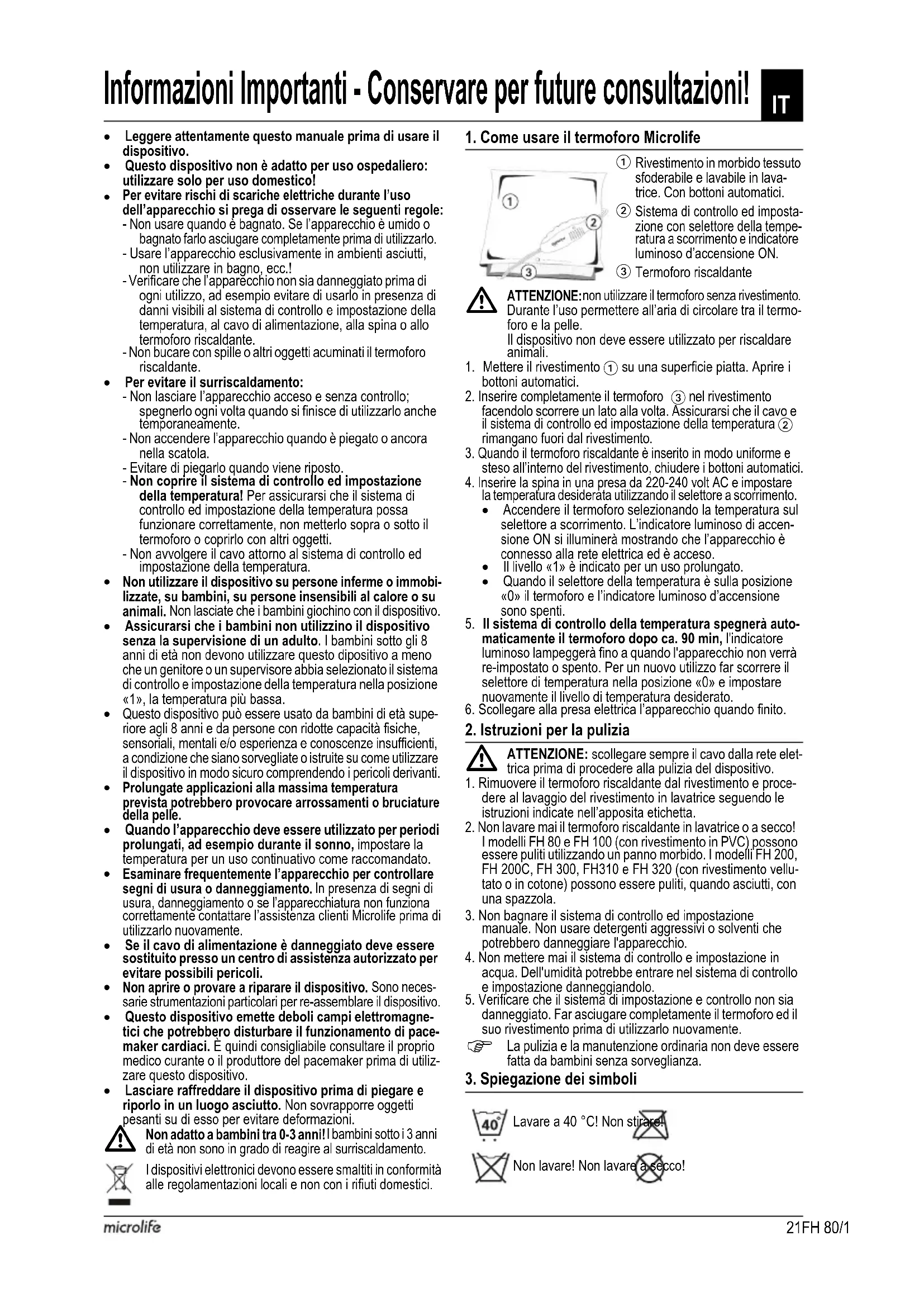 FH 80/A100, FH 100/A100, FH 200/B200, FH 200C/B200, FH 300/B100, FH 310/C100, FH 320/C100 Τάση: 220 - 240 V Ισχύς: 100 W Συχνότητα: 50 Hz21FH 80/100/200/200C/300/310/320 Leggere attentamente questo manuale prima di usare il dispositivo. Questo dispositivo non è adatto per uso ospedaliero: utilizzare solo per uso domestico! Per evitare rischi di scariche elettriche durante l’uso dell’apparecchio si prega di osservare le seguenti regole:- Non usare quando è bagnato. Se l’apparecchio è umido o bagnato farlo asciugare completamente prima di utilizzarlo.- Usare l’apparecchio esclusivamente in ambienti asciutti, non utilizzare in bagno, ecc.!- Verificare che l’apparecchio non sia danneggiato prima di ogni utilizzo, ad esempio evitare di usarlo in presenza di danni visibili al sistema di controllo e impostazione della temperatura, al cavo di alimentazione, alla spina o allo termoforo riscaldante.- Non bucare con spille o altri oggetti acuminati il termoforo riscaldante. Per evitare il surriscaldamento:- Non lasciare l’apparecchio acceso e senza controllo; spegnerlo ogni volta quando si finisce di utilizzarlo anche temporaneamente. - Non accendere l’apparecchio quando è piegato o ancora nella scatola. - Evitare di piegarlo quando viene riposto.- Non coprire il sistema di controllo ed impostazione della temperatura! Per assicurarsi che il sistema di controllo ed impostazione della temperatura possa funzionare correttamente, non metterlo sopra o sotto il termoforo o coprirlo con altri oggetti.- Non avvolgere il cavo attorno al sistema di controllo ed impostazione della temperatura. Non utilizzare il dispositivo su persone inferme o immobi-lizzate, su bambini, su persone insensibili al calore o su animali. Non lasciate che i bambini giochino con il dispositivo. Assicurarsi che i bambini non utilizzino il dispositivo senza la supervisione di un adulto. I bambini sotto gli 8 anni di età non devono utilizzare questo dipositivo a meno che un genitore o un supervisore abbia selezionato il sistema di controllo e impostazione della temperatura nella posizione «1», la temperatura più bassa. Questo dispositivo può essere usato da bambini di età supe-riore agli 8 anni e da persone con ridotte capacità fisiche, sensoriali, mentali e/o esperienza e conoscenze insufficienti, a condizione che siano sorvegliate o istruite su come utilizzare il dispositivo in modo sicuro comprendendo i pericoli derivanti. Prolungate applicazioni alla massima temperatura prevista potrebbero provocare arrossamenti o bruciature della pelle. Quando l’apparecchio deve essere utilizzato per periodi prolungati, ad esempio durante il sonno, impostare la temperatura per un uso continuativo come raccomandato. Esaminare frequentemente l’apparecchio per controllare segni di usura o danneggiamento. In presenza di segni di usura, danneggiamento o se l’apparecchiatura non funziona correttamente contattare l’assistenza clienti Microlife prima di utilizzarlo nuovamente. Se il cavo di alimentazione è danneggiato deve essere sostituito presso un centro di assistenza autorizzato per evitare possibili pericoli. Non aprire o provare a riparare il dispositivo. Sono neces-sarie strumentazioni particolari per re-assemblare il dispositivo. Questo dispositivo emette deboli campi elettromagne-tici che potrebbero disturbare il funzionamento di pace-maker cardiaci. È quindi consigliabile consultare il proprio medico curante o il produttore del pacemaker prima di utiliz-zare questo dispositivo. Lasciare raffreddare il dispositivo prima di piegare e riporlo in un luogo asciutto. Non sovrapporre oggetti pesanti su di esso per evitare deformazioni. Non adatto a bambini tra 0-3 anni! I bambini sotto i 3 anni di età non sono in grado di reagire al surriscaldamento.I dispositivi elettronici devono essere smaltiti in conformità alle regolamentazioni locali e non con i rifiuti domestici.