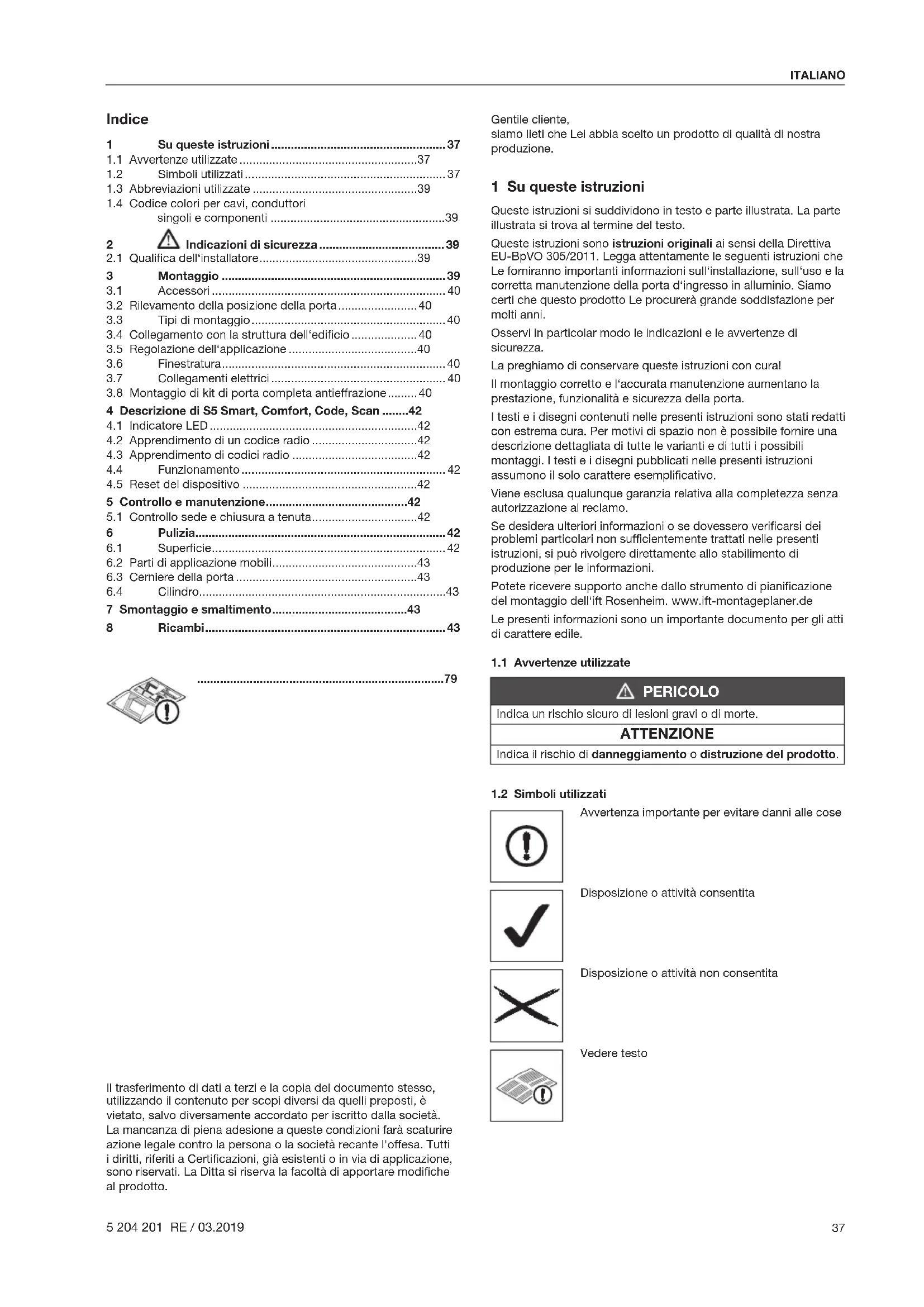 Gentile cliente, siamo lieti che Lei abbia scelto un prodotto di qualità di nostra produzione. 1 Su queste istruzioni Queste istruzioni si suddividono in testo e parte illustrata. La parte illustrata si trova al termine del testo. Queste istruzioni sono istruzioni originali ai sensi della Direttiva EU-BpVO 305/2011. Legga attentamente le seguenti istruzioni che Le forniranno importanti informazioni sull‘installazione, sull‘uso e la corretta manutenzione della porta d‘ingresso in alluminio. Siamo certi che questo prodotto Le procurerà grande soddisfazione per molti anni. Osservi in particolar modo le indicazioni e le avvertenze di sicurezza. La preghiamo di conservare queste istruzioni con cura! Il montaggio corretto e l‘accurata manutenzione aumentano la prestazione, funzionalità e sicurezza della porta. I testi e i disegni contenuti nelle presenti istruzioni sono stati redatti con estrema cura. Per motivi di spazio non è possibile fornire una descrizione dettagliata di tutte le varianti e di tutti i possibili montaggi. I testi e i disegni pubblicati nelle presenti istruzioni assumono il solo carattere esemplificativo. Viene esclusa qualunque garanzia relativa alla completezza senza autorizzazione al reclamo. Se desidera ulteriori informazioni o se dovessero verificarsi dei problemi particolari non sufficientemente trattati nelle presenti istruzioni, si può rivolgere direttamente allo stabilimento di produzione per le informazioni. Potete ricevere supporto anche dallo strumento di pianificazione del montaggio dell‘ift Rosenheim. www.ift-montageplaner.de Le presenti informazioni sono un importante documento per gli atti di carattere edile.