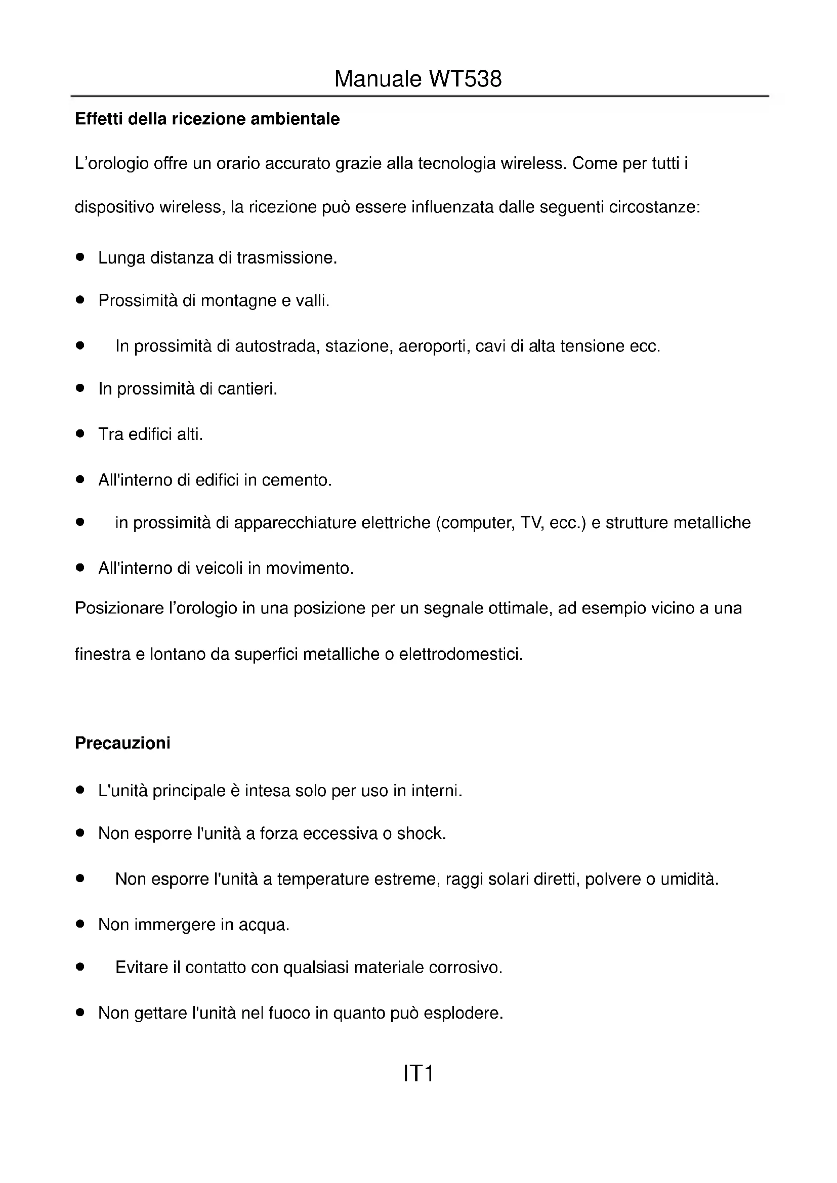Parte A – LCD positivo A1: Icona TempoDST A2: Icona radiocontrollo A3: Ora A4: Data e sveglia A5: GiornoManuale WT538 IT5 A6: Temperatura interna Parte B – Tasto posteriore e alimentazione B1: Finestra di proiezione B2: Tasto proiezione (ON/OFF) B3: Tasto “SET” B4: Pulsante “ALARM” B5: Tasto “+” B6: Pulsante “-” B7: Tasto “WAVE” B8: Interruttore sveglia (ON/OFF) B9: Tasto rotazione proiezione B10: Jack ingresso per adattatore DC Parte C – Tasto SUPERIORE touch C1: Tasto ritarda/luce Funzioni: Orologio DCF-77 radio controllato Formato 12/24 ore Regolazione zona oraria (± 12h) Impostazione manuale dell’oraManuale WT538 IT6 Proiezione ora Mostra data e giorno della settimana (7 lingue) Temperatura in °C o °F a scelta Funzione sveglia e ritardo automatico intervallo di misurazione interna: -9,9°C~49,9°C Alimentazione: Adattatore DC (incluso), batteria 1,5V “AAA” LR03 x 2 pezzi (non inclusa) Funzionamento iniziale Collegare il cavo di alimentazione in dotazione con la spina posteriore. In alternativa è possibile usare delle batterie. Aprire lo sportello dello scomparto batterie dell’orologio. Inserite 2 batterie di tipo AAA rispettando la polarità [i segni “+” e “–”]. Una volta inserite le batterie, tutte le icone del display LCD si accendono per 3 secondi, si sente un bip, e l’orologio rileva la temperatura interna. Poi l’orologio entra in modalità di ricezione del segnale orario radio controllato. Funzione di proiezione: La proiezione continua è possibile solo quando si usa il cavo di alimentazione. Premere il pulsante di rotazione proiezione (sotto il pulsante "+") per cambiare la proiezione.Manuale WT538 IT7