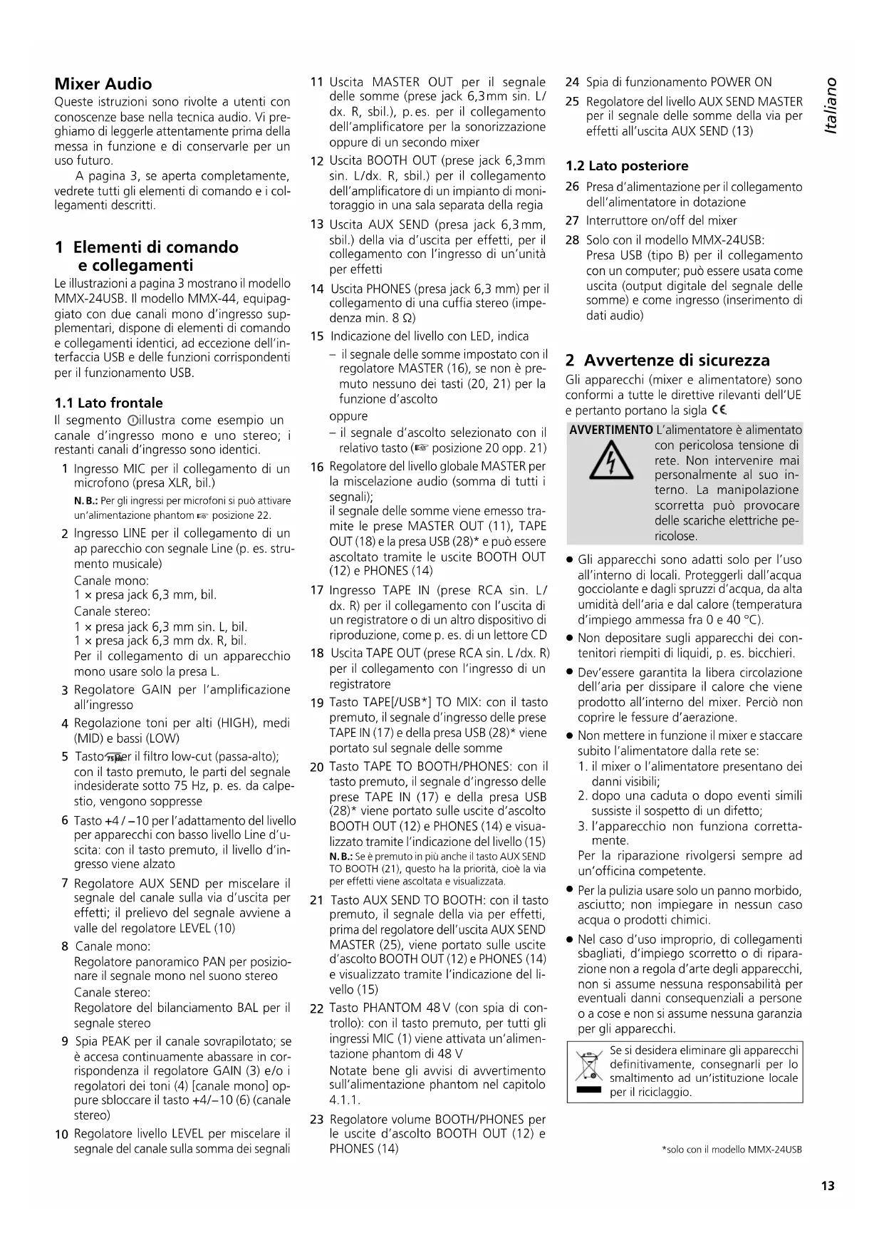 Presa d’alimentazione per il collegamento dell’alimentatore in dotazione 27 Interruttore on / off del mixer 28 Solo con il modello MMX-24USB: Presa USB (tipo B) per il collegamento con un computer; può essere usata come uscita (output digitale del segnale delle somme) e come ingresso (inserimento di dati audio) 2 Avvertenze di sicurezza Gli apparecchi (mixer e alimentatore) sono conformi a tutte le direttive rilevanti dell’UE e pertanto portano la sigla . AVVERTIMENTO L’alimentatore è alimentato con pericolosa tensione di rete. Non intervenire mai personalmente al suo in- terno. La manipolazione scorretta può provocare delle scariche elettriche pe- ricolose.