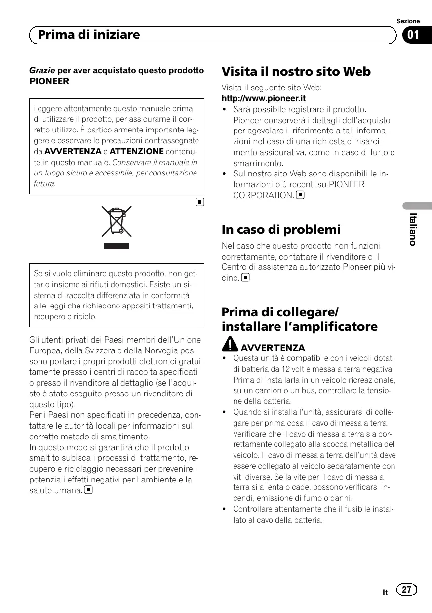 Visita il nostro sito Web Visita il seguente sito Web: http://www.pioneer.it ! Sarà possibile registrare il prodotto. Pioneer conserverà i dettagli dell’acquisto per agevolare il riferimento a tali informazioni nel caso di una richiesta di risarcimento assicurativa, come in caso di furto o smarrimento. ! Sul nostro sito Web sono disponibili le informazioni più recenti su PIONEER CORPORATION. Se si vuole eliminare questo prodotto, non gettarlo insieme ai rifiuti domestici. Esiste un sistema di raccolta differenziata in conformità alle leggi che richiedono appositi trattamenti, recupero e riciclo. Gli utenti privati dei Paesi membri dell’Unione Europea, della Svizzera e della Norvegia possono portare i propri prodotti elettronici gratuitamente presso i centri di raccolta specificati o presso il rivenditore al dettaglio (se l’acquisto è stato eseguito presso un rivenditore di questo tipo). Per i Paesi non specificati in precedenza, contattare le autorità locali per informazioni sul corretto metodo di smaltimento. In questo modo si garantirà che il prodotto smaltito subisca i processi di trattamento, recupero e riciclaggio necessari per prevenire i potenziali effetti negativi per l’ambiente e la salute umana. Nel caso che questo prodotto non funzioni correttamente, contattare il rivenditore o il Centro di assistenza autorizzato Pioneer più vicino. Italiano In caso di problemi Prima di collegare/ installare l’amplificatore AVVERTENZA ! Questa unità è compatibile con i veicoli dotati di batteria da 12 volt e messa a terra negativa. Prima di installarla in un veicolo ricreazionale, su un camion o un bus, controllare la tensione della batteria. ! Quando si installa l’unità, assicurarsi di collegare per prima cosa il cavo di messa a terra. Verificare che il cavo di messa a terra sia correttamente collegato alla scocca metallica del veicolo. Il cavo di messa a terra dell’unità deve essere collegato al veicolo separatamente con viti diverse. Se la vite per il cavo di messa a terra si allenta o cade, possono verificarsi incendi, emissione di fumo o danni. ! Controllare attentamente che il fusibile installato al cavo della batteria.