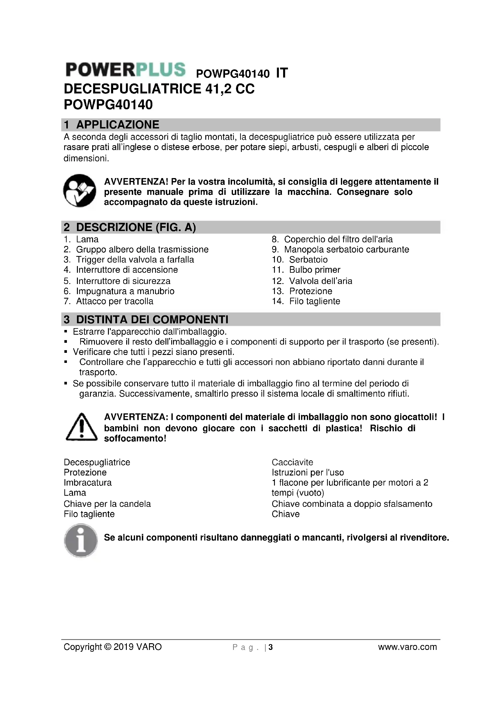 - All’avviamento o durante il funzionamento del motore, evitare di toccare parti calde quali la marmitta, il filo dell’alta tensione o la candela.POWPG40140 IT Copyright © 2019 VARO P a g . | 6 www.varo.com