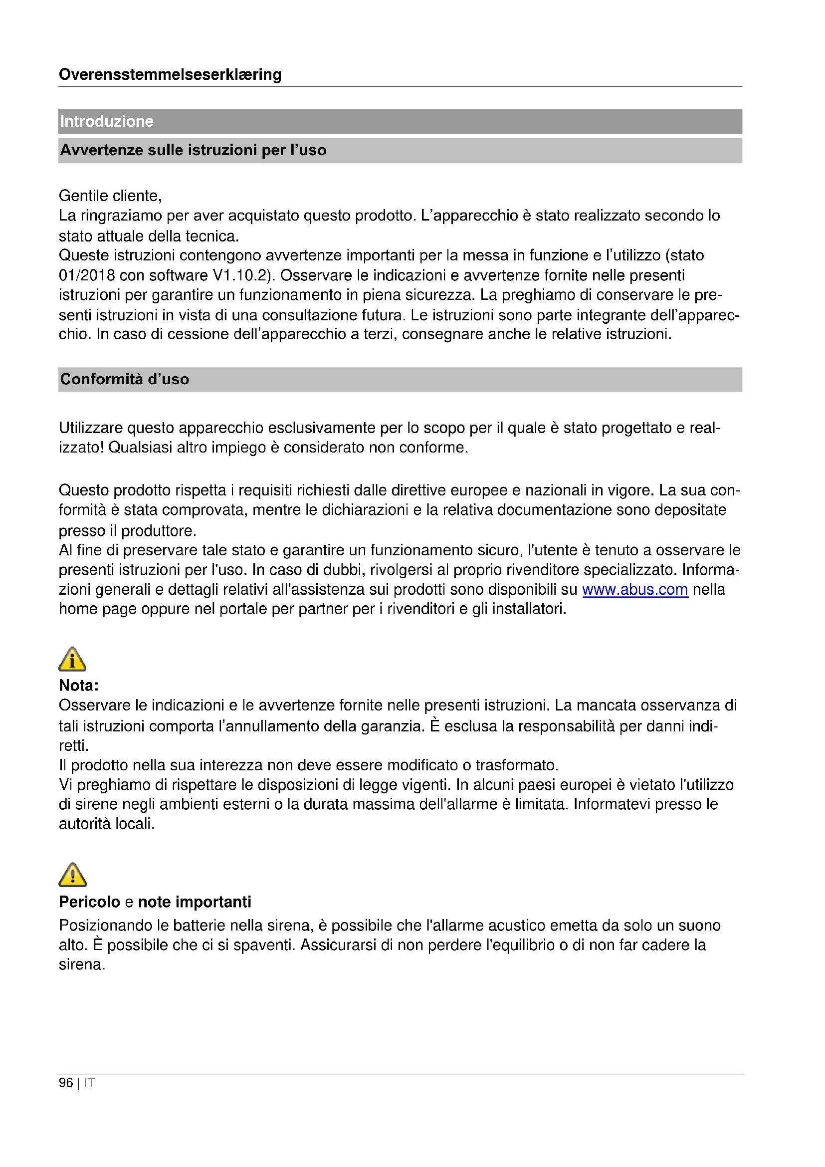 96 | IT Introduzione Avvertenze sulle istruzioni per l’uso Gentile cliente, La ringraziamo per aver acquistato questo prodotto. L’apparecchio è stato realizzato secondo lo stato attuale della tecnica. Queste istruzioni contengono avvertenze importanti per la messa in funzione e l’utilizzo (stato 01/2018 con software V1.10.2). Osservare le indicazioni e avvertenze fornite nelle presenti istruzioni per garantire un funzionamento in piena sicurezza. La preghiamo di conservare le pre- senti istruzioni in vista di una consultazione futura. Le istruzioni sono parte integrante dell’apparec- chio. In caso di cessione dell’apparecchio a terzi, consegnare anche le relative istruzioni. Conformità d’uso Utilizzare questo apparecchio esclusivamente per lo scopo per il quale è stato progettato e real- izzato! Qualsiasi altro impiego è considerato non conforme. Questo prodotto rispetta i requisiti richiesti dalle direttive europee e nazionali in vigore. La sua con- formità è stata comprovata, mentre le dichiarazioni e la relativa documentazione sono depositate presso il produttore. Al fine di preservare tale stato e garantire un funzionamento sicuro, l'utente è tenuto a osservare le presenti istruzioni per l'uso. In caso di dubbi, rivolgersi al proprio rivenditore specializzato. Informa- zioni generali e dettagli relativi all'assistenza sui prodotti sono disponibili su www.abus.com nella home page oppure nel portale per partner per i rivenditori e gli installatori.
