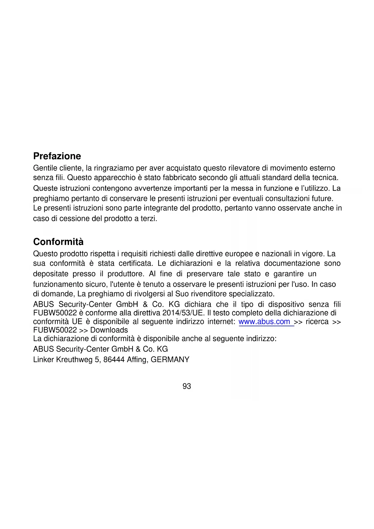 FUBW5002293 Prefazione Gentile cliente, la ringraziamo per aver acquistato questo rilevatore di movimento esterno senza fili. Questo apparecchio è stato fabbricato secondo gli attuali standard della tecnica. Queste istruzioni contengono avvertenze importanti per la messa in funzione e l’utilizzo. La preghiamo pertanto di conservare le presenti istruzioni per eventuali consultazioni future. Le presenti istruzioni sono parte integrante del prodotto, pertanto vanno osservate anche in caso di cessione del prodotto a terzi. Conformità Questo prodotto rispetta i requisiti richiesti dalle direttive europee e nazionali in vigore. La sua conformità è stata certificata. Le dichiarazioni e la relativa documentazione sono depositate presso il produttore. Al fine di preservare tale stato e garantire un funzionamento sicuro, l'utente è tenuto a osservare le presenti istruzioni per l'uso. In caso di domande, La preghiamo di rivolgersi al Suo rivenditore specializzato. ABUS Security-Center GmbH & Co. KG dichiara che il tipo di dispositivo senza fili FUBW50022 è conforme alla direttiva 2014/53/UE. Il testo completo della dichiarazione di conformità UE è disponibile al seguente indirizzo internet: www.abus.com >> ricerca >> FUBW50022 >> Downloads La dichiarazione di conformità è disponibile anche al seguente indirizzo: ABUS Security-Center GmbH & Co. KG Linker Kreuthweg 5, 86444 Affing, GERMANY94 Conformità d’uso Osservare le indicazioni e le avvertenze fornite nelle presenti istruzioni. La mancata osservanza di tali istruzioni comporta l’annullamento della garanzia. È esclusa la responsabilità per danni indiretti. Il prodotto nella sua interezza non deve essere modificato o trasformato. È stato fatto tutto il possibile per garantire la correttezza del contenuto di queste istruzioni. In ogni caso, il redattore e ABUS Security-Center GmbH & Co. KG declinano qualsiasi responsabilità per eventuali perdite o danni dovuti a uso improprio o mancata osservanza delle istruzioni e avvertenze sulla sicurezza. Il contenuto di queste istruzioni può subire modifiche senza preavviso. Avvertenze sulla batteria L'apparecchio viene alimentato con tensione continua tramite due batterie CR123A da 3 V. Al fine di garantire una lunga durata utile ed evitare incendi e lesioni, osservare le seguenti avvertenze: Non smaltire le batterie insieme ai rifiuti domestici Le batterie non vanno esposte direttamente a fonti di calore o a raggi solari, né vanno conservate in luoghi con temperature estremamente elevate. Le batterie non devono essere bruciate. Le batterie non devono entrare in contatto con l’acqua Le batterie non devono essere smontate, forate o danneggiate. I contatti delle batterie non devono essere cortocircuitati.95 Tenere le batterie fuori dalla portata dei bambini. Le batterie non sono ricaricabili. Smaltimento Smaltimento in base alla direttiva WEEE 2002/96 CE Il prodotto contiene materie prime preziose. Al termine della sua vita utile, smaltire il prodotto secondo le disposizioni di legge vigenti. Il prodotto e i relativi accessori devono essere raccolti all'interno dell'UE e smaltiti separatamente. Gli apparecchi che presentano questo simbolo non vanno smaltiti assieme ai rifiuti domestici. La preghiamo di rivolgersi al Suo rivenditore oppure smaltire i prodotti nei centri di raccolta comunali per apparecchi elettrici. Dotazione 1 x rilevatore di movimento esterno PIR senza fili 1 x chiave a brugola 2 x batterie al litio CR123 / CR17345 da 3 V 1 x utensile speciale di plastica 2 x piedi di fissaggio di riserva per contatto antirimozione a parete 1 x istruzioni per l'uso 1 x adattatore per parete per contatto antirimozione a parete 1 x mater. di mont. incl. dima di foratura 1 x adesivo (Long / Medium Beam Mask) 2 x diaframma (coperchi a scorrimento)96 Caratteristiche Questo rilevatore di movimento esterno senza fili funziona con due rilevatori a raggi rossi passivi indipendenti in un alloggiamento adatto per l'impiego in ambienti esterni. Entrambi i sensori devono attivarsi affinché il rilevatore faccia scattare un segnale di allarme. Questo rilevatore di alta precisione e affidabilità è concepito per essere usato in sistemi di allarme. È possibile configurare sia il conteggio degli impulsi che il campo di rilevamento (da 10 a 30 metri). Dispone inoltre di un contatto antimanomissione su coperchio e di un contatto antirimozione a parete. Nell'alloggiamento, il sensore può essere orientato di 180° e inclinato di 90°. Questo aumenta le prestazioni della sorveglianza esterna garantendo una rilevazione estremamente precisa del sensore. La scheda è rivestita in acrilico. L'alloggiamento in polietilene resistente è di alta qualità e dispone di una copertura frontale trasparente resistente ai raggi UV che rende il sensore impermeabile e lo protegge dagli influssi atmosferici. La combinazione fra elettronica di precisione, filtro a luce bianca e doppia schermatura previene falsi allarmi causati dalla luce solare o da altre fonti di disturbo. Il design del rilevatore di movimento esterno ha un aspetto piacevole e professionale che impedisce di capire l'orientamento del sensore.97 Opzionale per contatto Montaggio Non toccare l'antenna durante il montaggio e non piegarla in nessun caso!