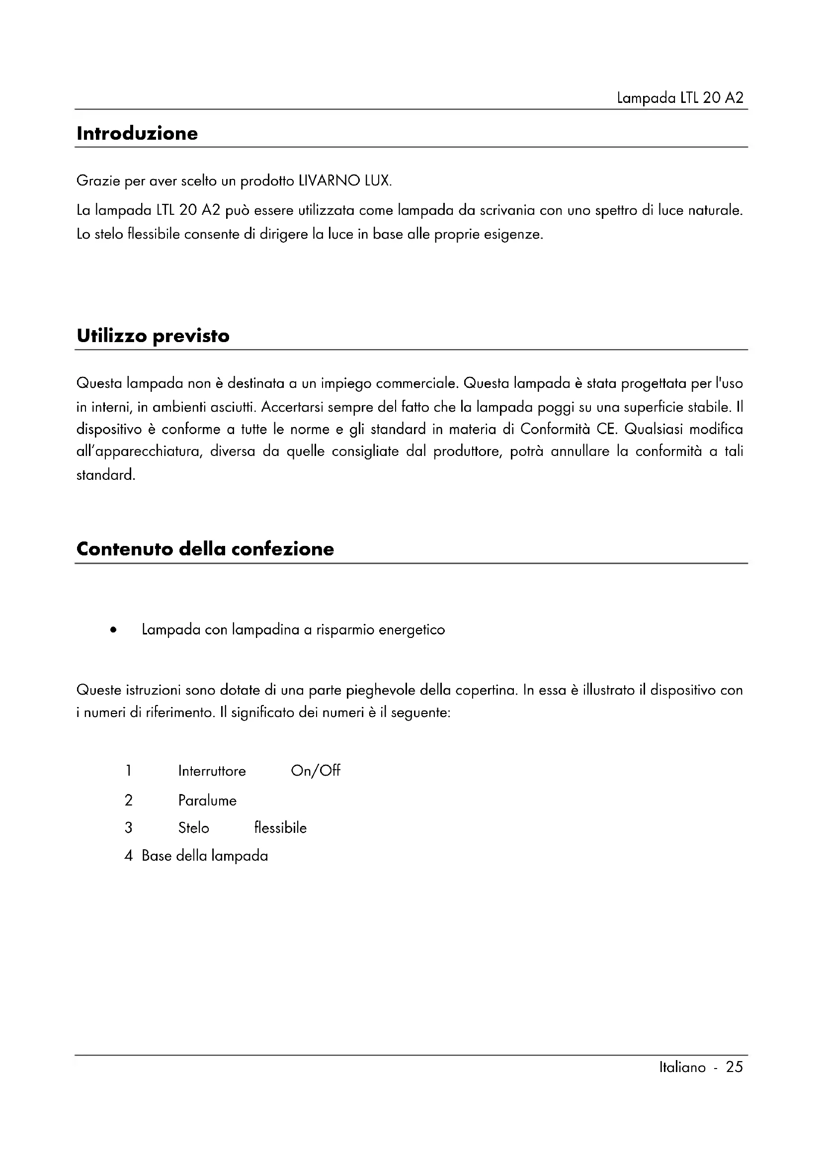 Utilizzo previsto Questa lampada non è destinata a un impiego commerciale. Questa lampada è stata progettata per l'uso in interni, in ambienti asciutti. Accertarsi sempre del fatto che la lampada poggi su una superficie stabile. Il dispositivo è conforme a tutte le norme e gli standard in materia di Conformità CE. Qualsiasi modifica all’apparecchiatura, diversa da quelle consigliate dal produttore, potrà annullare la conformità a tali standard. Contenuto della confezione Lampada con lampadina a risparmio energetico Queste istruzioni sono dotate di una parte pieghevole della copertina. In essa è illustrato il dispositivo con i numeri di riferimento. Il significato dei numeri è il seguente: 1 Interruttore On/Off 2 Paralume 3 Stelo flessibile 4 Base della lampadaLampada LTL 20 A2