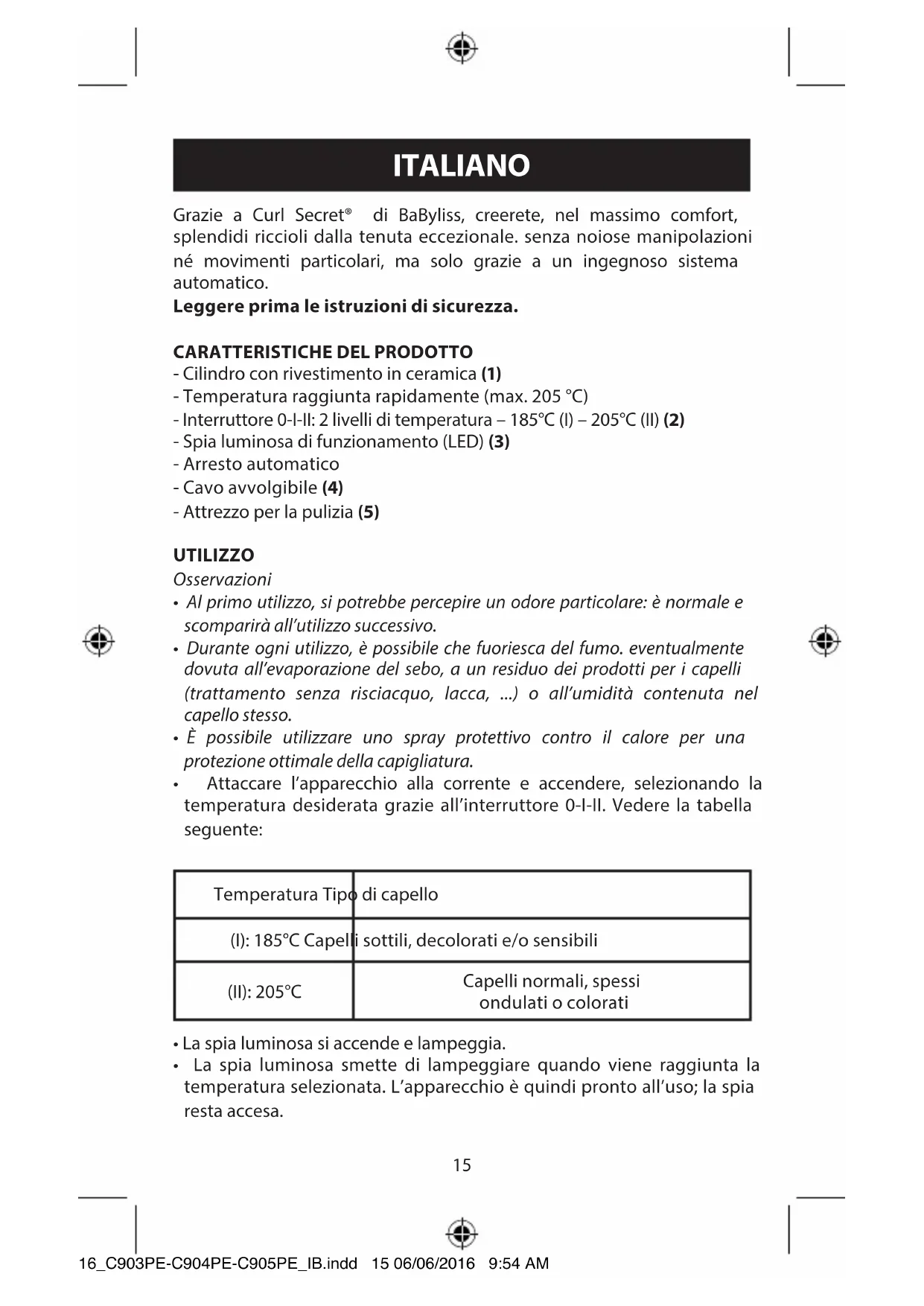 - Cilindro con rivestimento in ceramica (1) - Temperatura raggiunta rapidamente (max. 205 °C) - Interruttore 0-I-II: 2 livelli di temperatura – 185°C (I) – 205°C (II) (2) - Spia luminosa di funzionamento (LED) (3) - Arresto automatico - Cavo avvolgibile (4) - Attrezzo per la pulizia (5) UTILIZZO Osservazioni