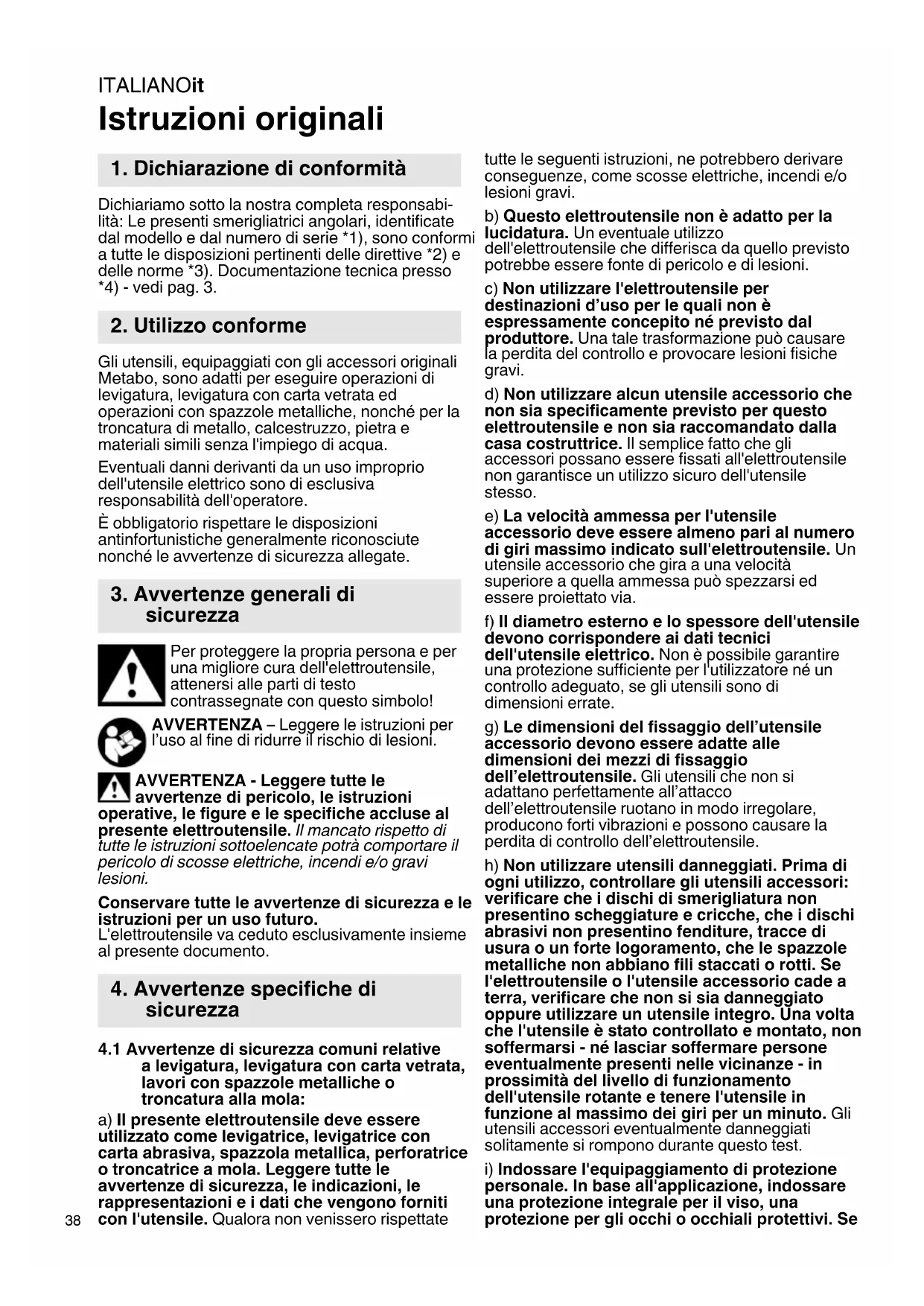 Istruzioni originali Dichiariamo sotto la nostra completa responsabi- lità: Le presenti smerigliatrici angolari, identificate dal modello e dal numero di serie *1), sono conformi a tutte le disposizioni pertinenti delle direttive *2) e delle norme *3). Documentazione tecnica presso *4) - vedi pag. 3. Gli utensili, equipaggiati con gli accessori originali Metabo, sono adatti per eseguire operazioni di levigatura, levigatura con carta vetrata ed operazioni con spazzole metalliche, nonché per la troncatura di metallo, calcestruzzo, pietra e materiali simili senza l'impiego di acqua. Eventuali danni derivanti da un uso improprio dell'utensile elettrico sono di esclusiva responsabilità dell'operatore. È obbligatorio rispettare le disposizioni antinfortunistiche generalmente riconosciute nonché le avvertenze di sicurezza allegate. Per proteggere la propria persona e per una migliore cura dell'elettroutensile, attenersi alle parti di testo contrassegnate con questo simbolo! AVVERTENZA – Leggere le istruzioni per l’uso al fine di ridurre il rischio di lesioni. AVVERTENZA - Leggere tutte le avvertenze di pericolo, le istruzioni operative, le figure e le specifiche accluse al presente elettroutensile. Il mancato rispetto di tutte le istruzioni sottoelencate potrà comportare il pericolo di scosse elettriche, incendi e/o gravi lesioni. Conservare tutte le avvertenze di sicurezza e le istruzioni per un uso futuro. L'elettroutensile va ceduto esclusivamente insieme al presente documento.