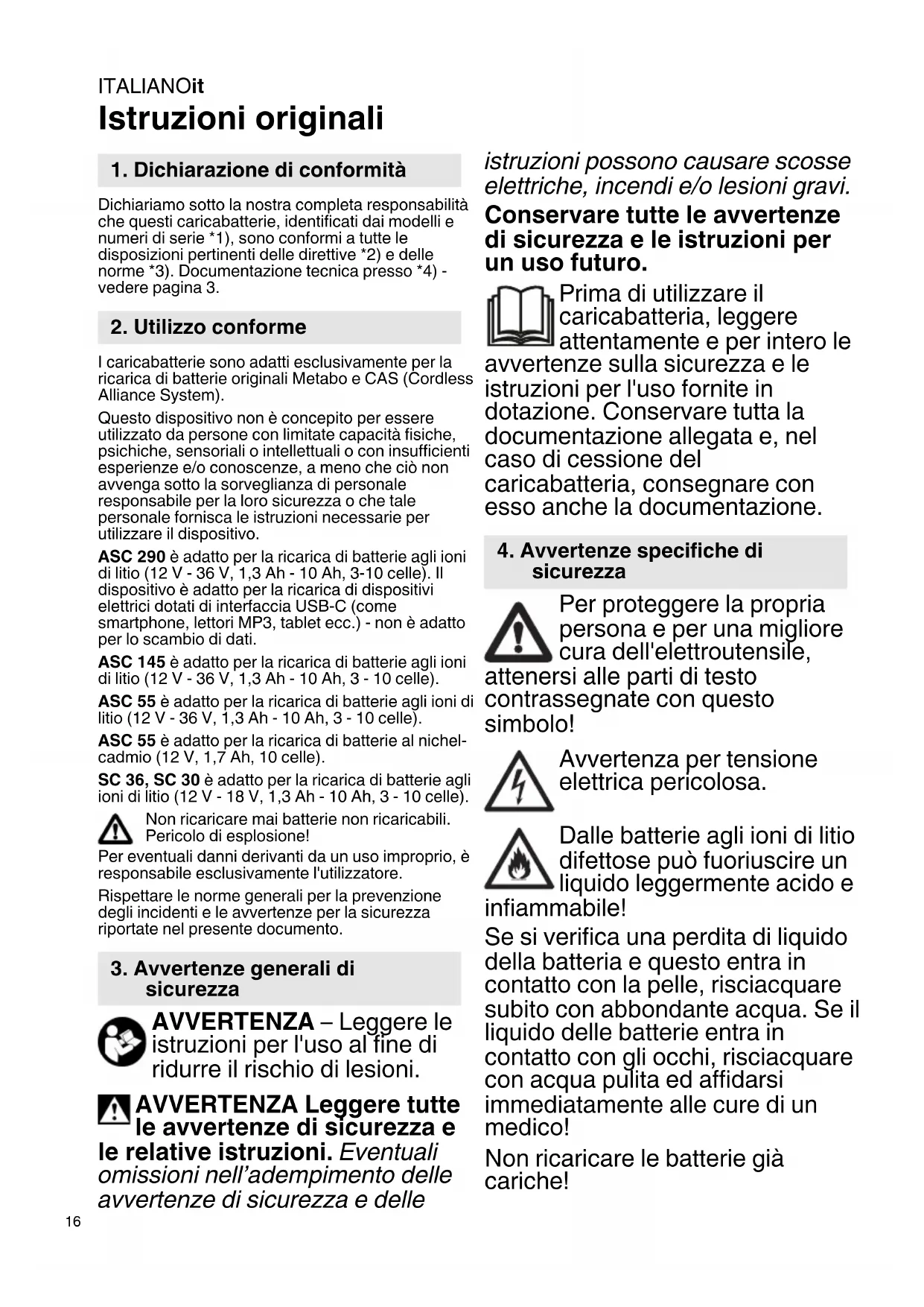 Istruzioni originali Dichiariamo sotto la nostra completa responsabilità che questi caricabatterie, identificati dai modelli e numeri di serie *1), sono conformi a tutte le disposizioni pertinenti delle direttive *2) e delle norme *3). Documentazione tecnica presso *4) - vedere pagina 3. I caricabatterie sono adatti esclusivamente per la ricarica di batterie originali Metabo e CAS (Cordless Alliance System). Questo dispositivo non è concepito per essere utilizzato da persone con limitate capacità fisiche, psichiche, sensoriali o intellettuali o con insufficienti esperienze e/o conoscenze, a meno che ciò non avvenga sotto la sorveglianza di personale responsabile per la loro sicurezza o che tale personale fornisca le istruzioni necessarie per utilizzare il dispositivo. ASC 290 è adatto per la ricarica di batterie agli ioni di litio (12 V - 36 V, 1,3 Ah - 10 Ah, 3-10 celle). Il dispositivo è adatto per la ricarica di dispositivi elettrici dotati di interfaccia USB-C (come smartphone, lettori MP3, tablet ecc.) - non è adatto per lo scambio di dati. ASC 145 è adatto per la ricarica di batterie agli ioni di litio (12 V - 36 V, 1,3 Ah - 10 Ah, 3 - 10 celle). ASC 55 è adatto per la ricarica di batterie agli ioni di litio (12 V - 36 V, 1,3 Ah - 10 Ah, 3 - 10 celle). ASC 55 è adatto per la ricarica di batterie al nichel- cadmio (12 V, 1,7 Ah, 10 celle). SC 36, SC 30 è adatto per la ricarica di batterie agli ioni di litio (12 V - 18 V, 1,3 Ah - 10 Ah, 3 - 10 celle). Non ricaricare mai batterie non ricaricabili. Pericolo di esplosione! Per eventuali danni derivanti da un uso improprio, è responsabile esclusivamente l'utilizzatore. Rispettare le norme generali per la prevenzione degli incidenti e le avvertenze per la sicurezza riportate nel presente documento. AVVERTENZA – Leggere le istruzioni per l'uso al fine di ridurre il rischio di lesioni. AVVERTENZA Leggere tutte le avvertenze di sicurezza e le relative istruzioni. Eventuali omissioni nell’adempimento delle avvertenze di sicurezza e delle istruzioni possono causare scosse elettriche, incendi e/o lesioni gravi. Conservare tutte le avvertenze di sicurezza e le istruzioni per un uso futuro. Prima di utilizzare il caricabatteria, leggere attentamente e per intero le avvertenze sulla sicurezza e le istruzioni per l'uso fornite in dotazione. Conservare tutta la documentazione allegata e, nel caso di cessione del caricabatteria, consegnare con esso anche la documentazione. Per proteggere la propria persona e per una migliore cura dell'elettroutensile, attenersi alle parti di testo contrassegnate con questo simbolo! Avvertenza per tensione elettrica pericolosa. Dalle batterie agli ioni di litio difettose può fuoriuscire un liquido leggermente acido e infiammabile! Se si verifica una perdita di liquido della batteria e questo entra in contatto con la pelle, risciacquare subito con abbondante acqua. Se il liquido delle batterie entra in contatto con gli occhi, risciacquare con acqua pulita ed affidarsi immediatamente alle cure di un medico! Non ricaricare le batterie già cariche!