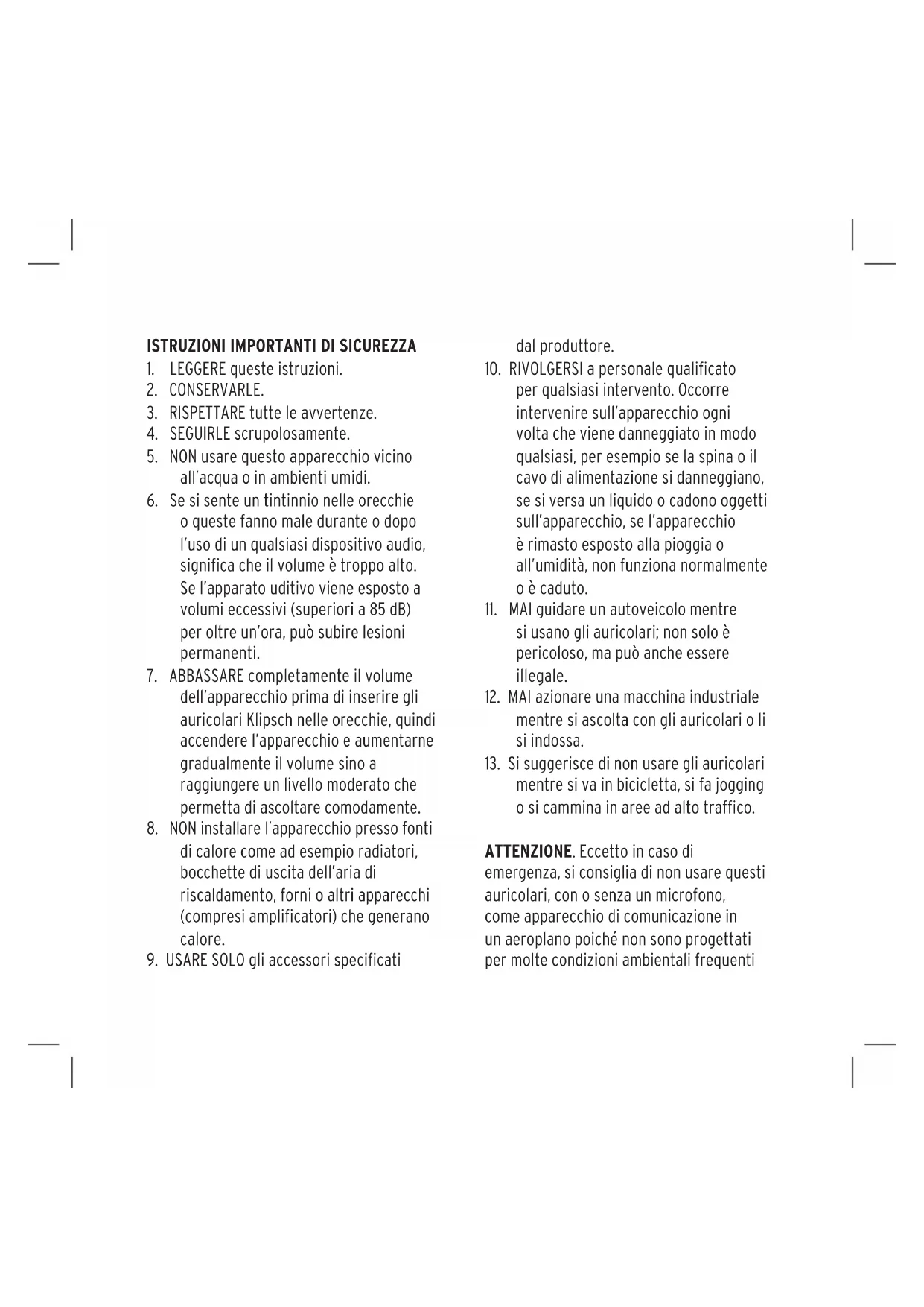 dell’apparecchio prima di inserire gli auricolari Klipsch nelle orecchie, quindi accendere l’apparecchio e aumentarne gradualmente il volume sino a raggiungere un livello moderato che permetta di ascoltare comodamente.