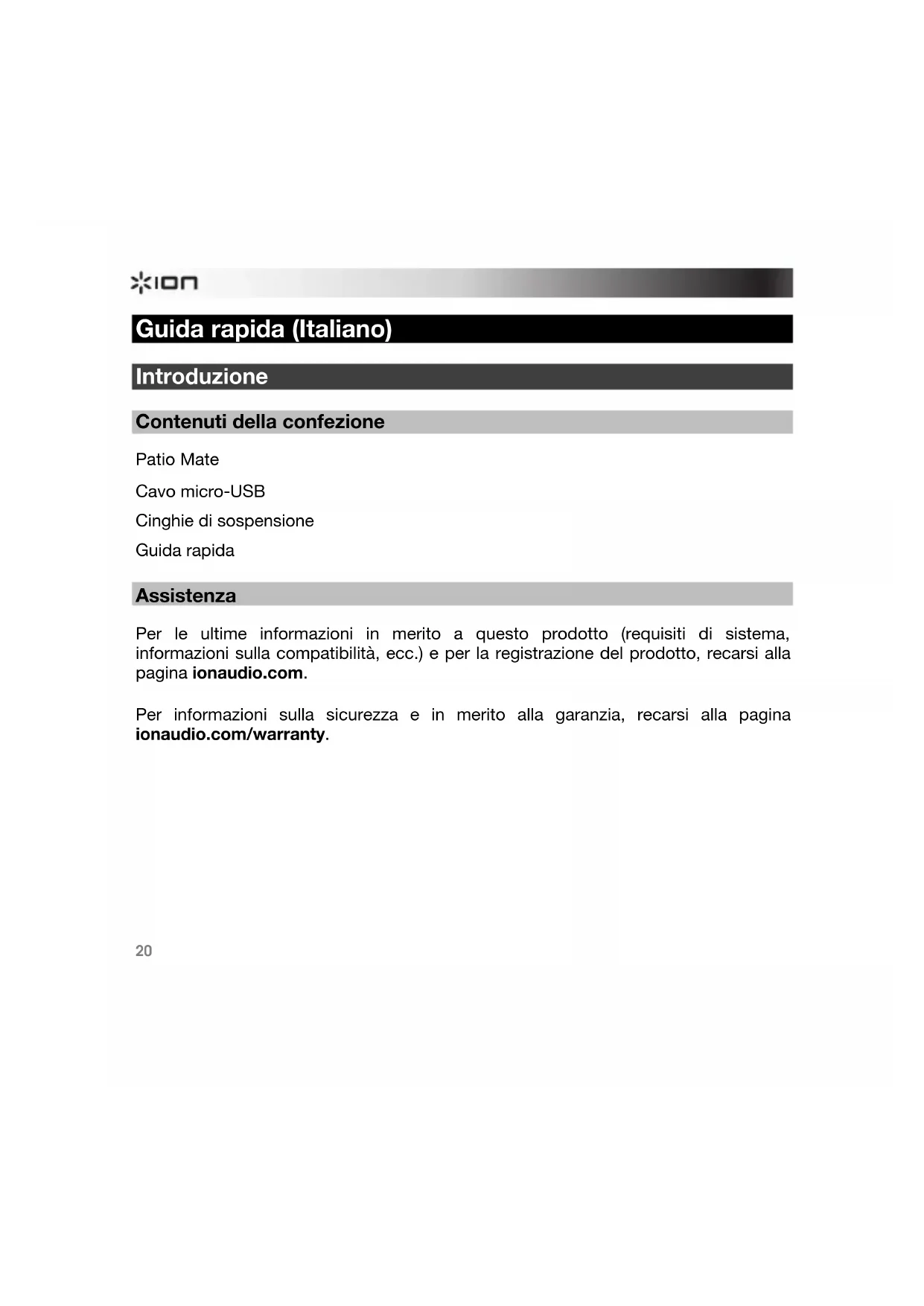 Guida rapida (Italiano) Introduzione Contenuti della confezione Patio Mate Cavo micro-USB Cinghie di sospensione Guida rapida Assistenza Per le ultime informazioni in merito a questo prodotto (requisiti di sistema, informazioni sulla compatibilità, ecc.) e per la registrazione del prodotto, recarsi alla pagina ionaudio.com. Per informazioni sulla sicurezza e in merito alla garanzia, recarsi alla pagina ionaudio.com/warranty.21