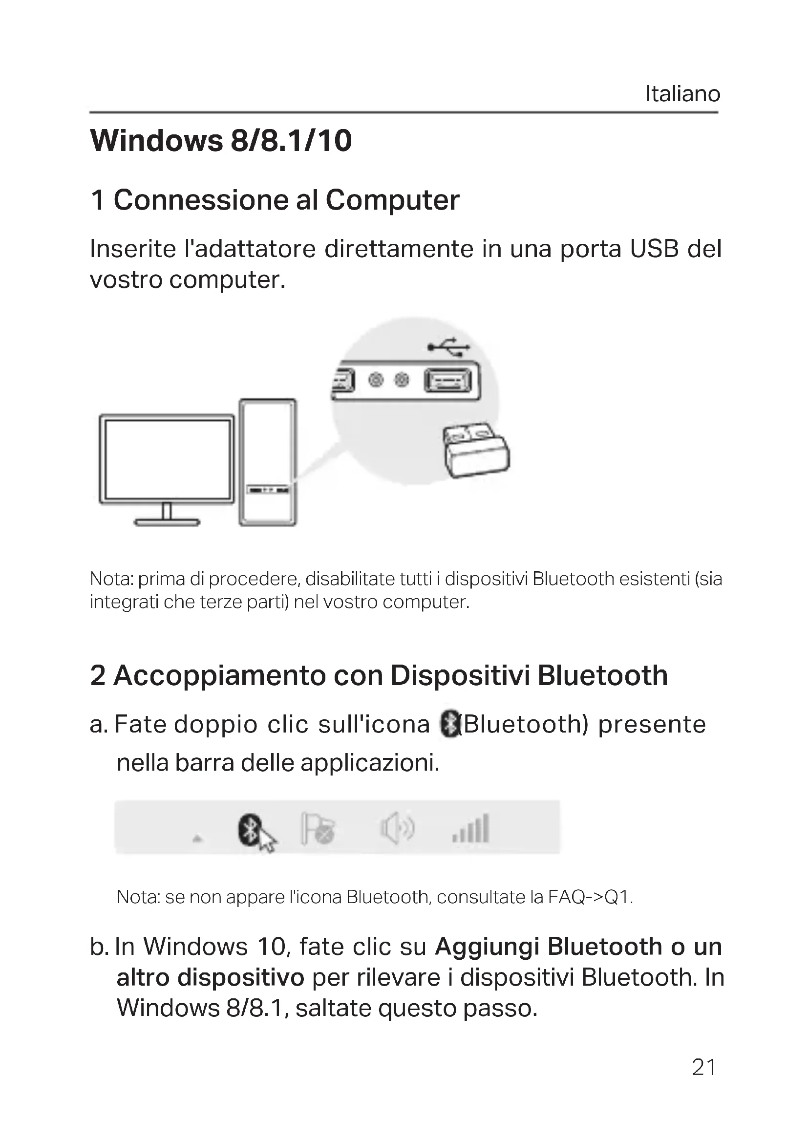 Windows 8/8.1/10 1 Connessione al Computer Inserite l'adattatore direttamente in una porta USB del vostro computer. Nota: prima di procedere, disabilitate tutti i dispositivi Bluetooth esistenti (sia integrati che terze parti) nel vostro computer. 2 Accoppiamento con Dispositivi Bluetooth a. Fate doppio clic sull'icona (Bluetooth) presente nella barra delle applicazioni. Nota: se non appare l'icona Bluetooth, consultate la FAQ->Q1. b. In Windows 10, fate clic su Aggiungi Bluetooth o un altro dispositivo per rilevare i dispositivi Bluetooth. In Windows 8/8.1, saltate questo passo.Italiano