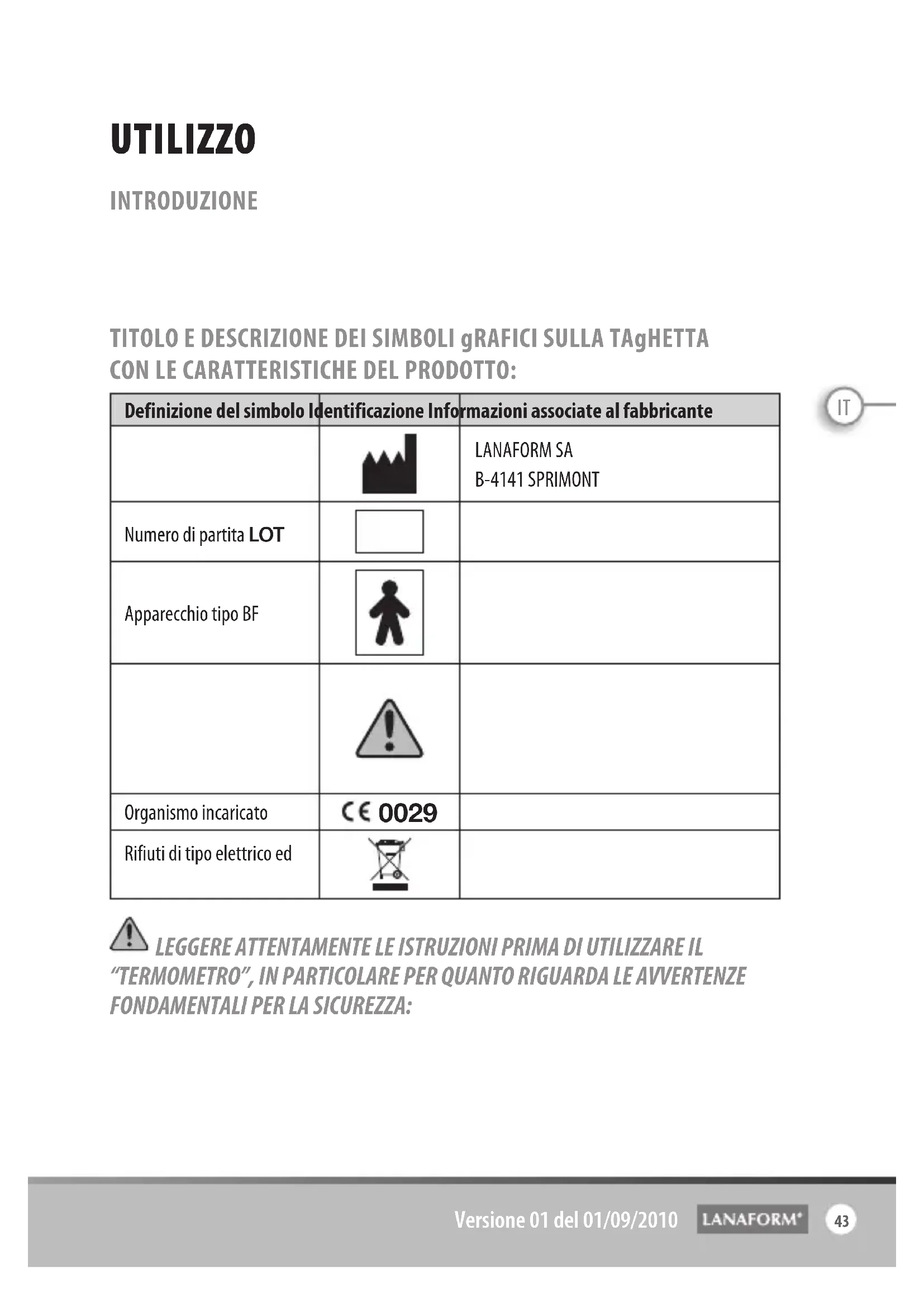 Version 01 vom 01.09.2010IT Versione 01 del 01/09/2010 utIlIzzo INTRODUZIONE Vi ringraziamo per aver acquistato “THERMOMETER 4 In 1” di LANAFORM®.Questo termometro auricolare e frontale di LANAFORM vi consentirà di misurare correttamente la temperatura grazie alla tecnologia ad infrarossi di cui è dotato. TITOLO E DESCRIZIONE DEI SIMBOLI gRAFICI SULLA TAgHETTA CON LE CARATTERISTICHE DEL PRODOTTO: Definizione del simbolo Identificazione Informazioni associate al fabbricanteCoordinate del produttoreLANAFORM SAB-4141 SPRIMONTNumero di partita LOTApparecchio tipo BFAttenzione, consultare le istruzioniAttenzione, consultare i documenti allegati. Leggere le istruzioni prima di utilizzare l’apparecchio. Rispettare scrupolosamente queste istruzioni quando si utilizza l’apparecchio.Organismo incaricato Rifiuti di tipo elettrico ed elettronico (DEEE) LEGGERE ATTENTAMENTE LE ISTRUZIONI PRIMA DI UTILIZZARE IL “TERMOMETRO”, IN PARTICOLARE PER QUANTO RIGUARDA LE AVVERTENZE FONDAMENTALI PER LA SICUREZZA:
