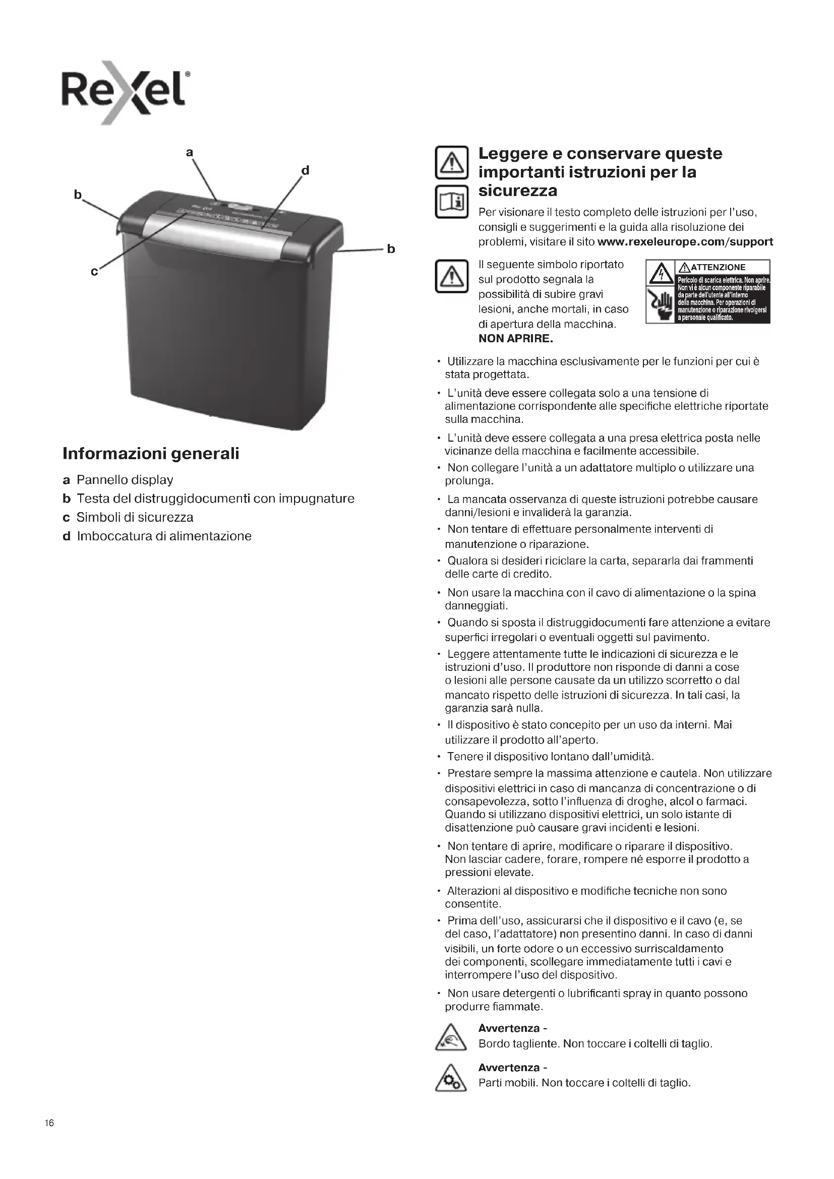 - Non usare detergenti o lubrificanti spray in quanto possono produrre fiammate. Leggere e conservare queste importanti istruzioni per la sicurezza Per visionare il testo completo delle istruzioni per l’uso, consigli e suggerimenti e la guida alla risoluzione dei problemi, visitare il sito www.rexeleurope.com/support Il seguente simbolo riportato sul prodotto segnala la possibilità di subire gravi lesioni, anche mortali, in caso di apertura della macchina. NON APRIRE. Pericolo di scarica elettrica. Non aprire. Non vi è alcun componente riparabile da parte dell’utente all’interno della macchina. Per operazioni di manutenzione o riparazione rivolgersi a personale qualicato. ATTENZIONE