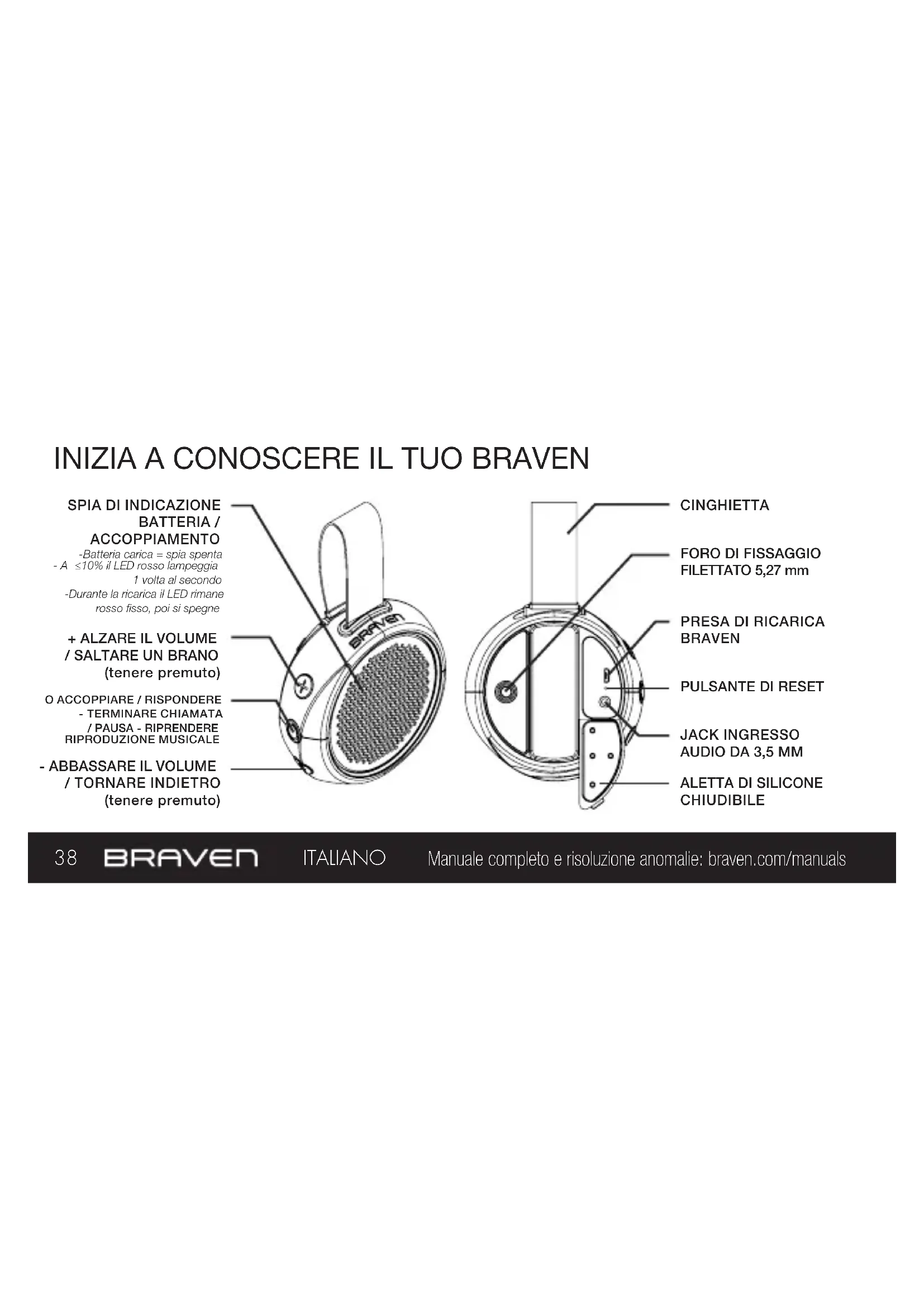 attivo e se lasciato acceso, il BRAVEN si spegne dopo 30 minuti. Per riavviare il BRAVEN è necessario tenere premuto il pulsante di accensione per 2-3 secondi.40 Manuale completo e risoluzione anomalie: braven.com/manuals ITALIANO