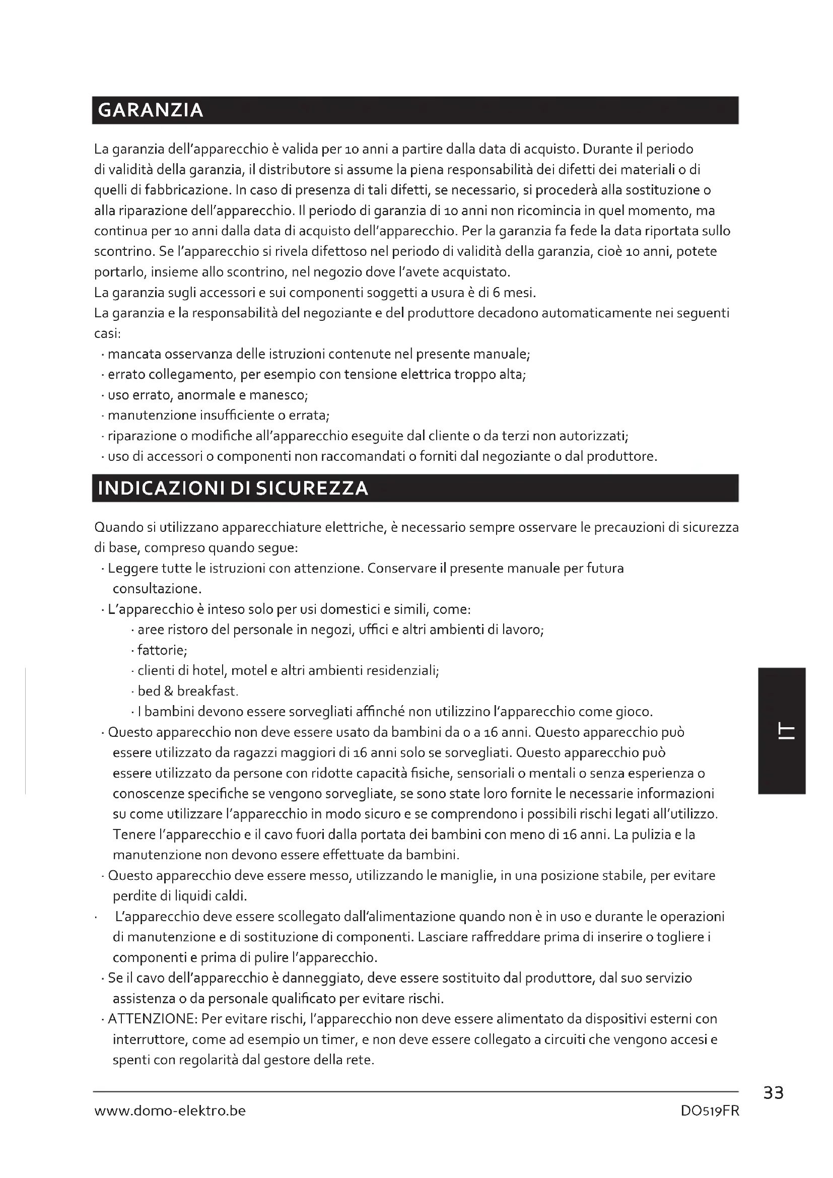 - In caso di incendio, non cercare mai di spegnerlo con acqua. Togliere il cavo, chiudere il coperchio e soocare le amme con un panno umido.35 DO519FR www.domo-elektro.be