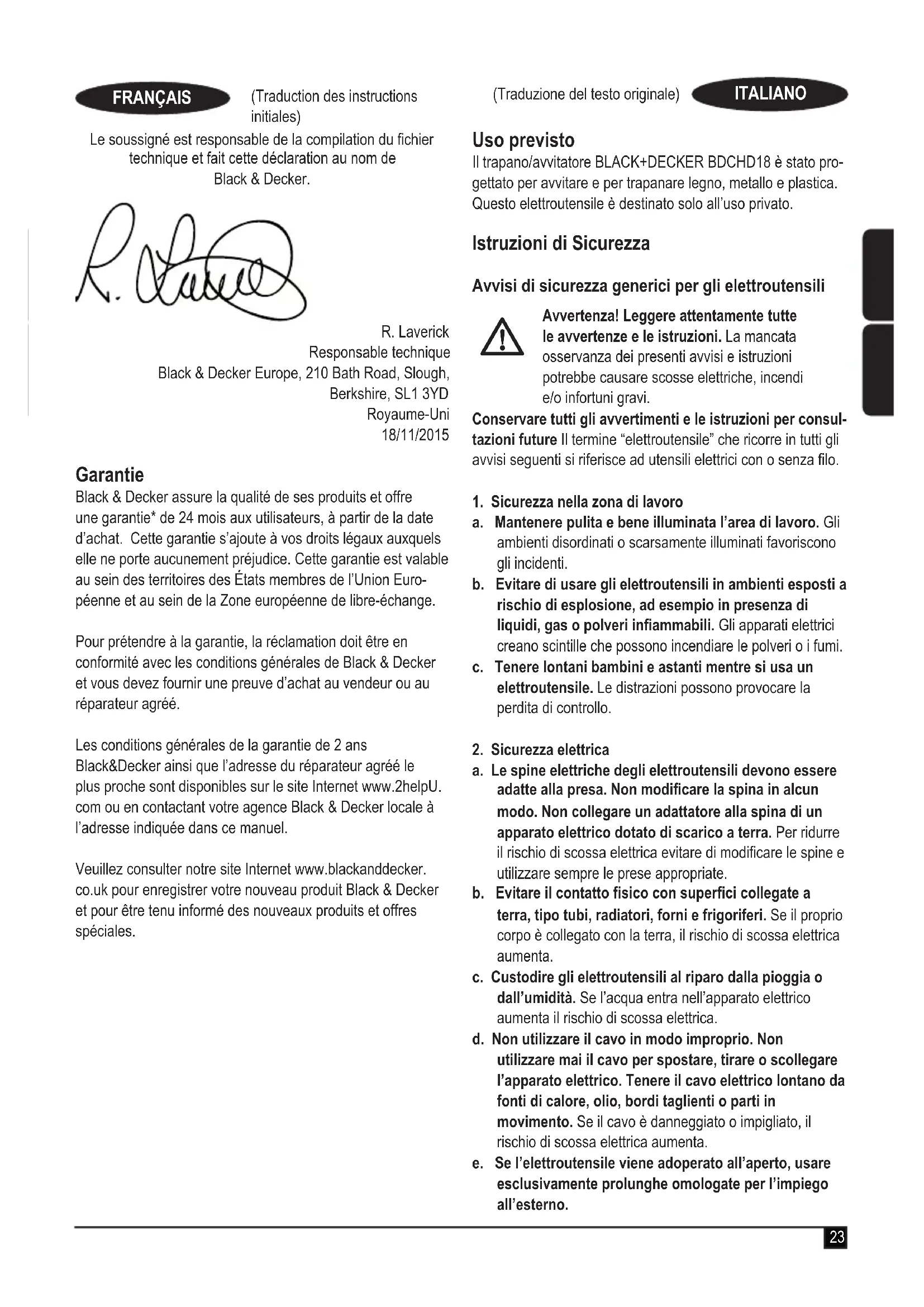 Trapano/avvitatore BDCDC18 Black & Decker dichiara che i prodotti descritti al paragrafo “Dati tecnici” sono conformi alle seguenti normative: 2006/42/CE, EN 60745-1, EN 60745-2-1 Questi prodotti sono conformi alle Direttive 2004/108/CE (no al 19/04/2016), 2014/30/UE (dal 20/04/2016) e 2011/65/UE. Per ulteriori informazioni contattare Black & Decker al seguente indirizzo oppure consultare l’ultima di copertina del manuale. Il rmatario è responsabile della compilazione del documento tecnico e rende questa dichiarazione per conto di Black & Decker. R. Laverick Engineering Manager Black & Decker Europe, 210 Bath Road, Slough, Berkshire, SL1 3YD Regno Unito 18/11/201530 (Traduzione del testo originale) ITALIANO (Vertaling van de originele instructies) NEDERLANDS Garanzia Black & Decker è sicura della qualità dei propri prodotti e offre ai consumatori una garanzia di 24 mesi dalla data di acquisto. Il presente certicato di garanzia è complementare ai diritti legali e non li pregiudica in alcun modo. La garanzia è valida sui territori degli stati membri dell’Unione Europea o dell’EFTA ( Associazione europea di libero scambio). Per attivare la garanzia, il reclamo deve essere effettuato in accordo con i Termini e Condizioni Black & Decker e sarà necessario presentare la prova di acquisto al venditore o all’agente di riparazione autorizzato. I Termini e condizioni della garanzia Black & Decker di 2 anni e la sede dell’agente di riparazione autorizzato più vicino sono consultabili su Internet all’indirizzo www.2helpU.com, o con- tattando l’ufcio Black & Decker di zona all’indirizzo indicato in questo manuale. Visitare il nostro sito www.blackanddecker.co.uk per registrare il nuovo prodotto Black & Decker e ricevere gli aggiornamenti sui nuovi prodotti e le offerte speciali. Bedoeld gebruik Uw BLACK+DECKER boormachine van het type BDCHD18 is ontworpen voor het boren in hout, metaal en metselwerk, maar kan ook als schroevendraaier worden gebruikt. Dit ge- reedschap is uitsluitend bestemd voor consumentengebruik. Instructies voor de veiligheid Algemene veiligheidswaarschuwingen voor elek- trisch gereedschap