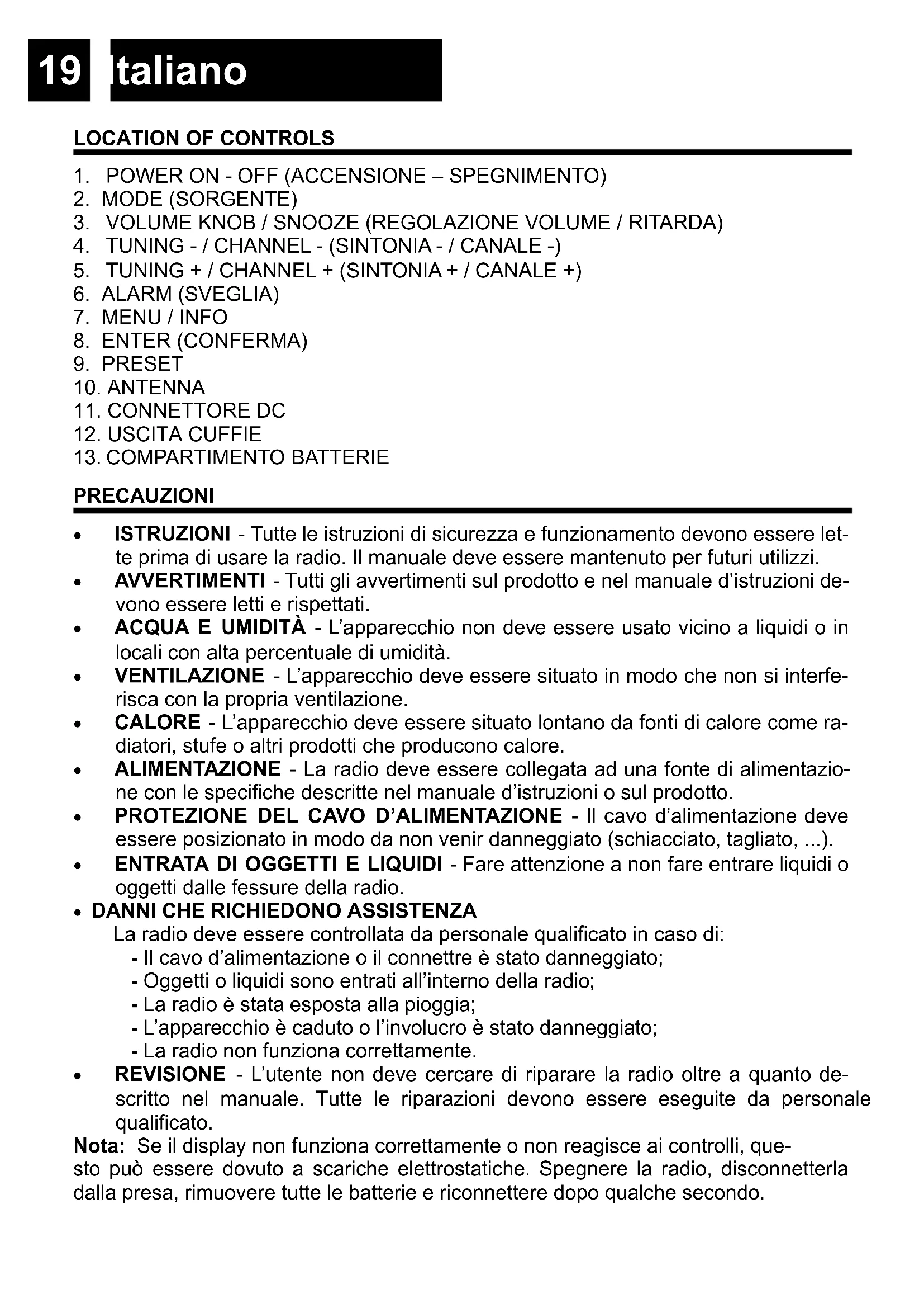 La radio deve essere controllata da personale qualificato in caso di: - Il cavo d’alimentazione o il connettre è stato danneggiato; - Oggetti o liquidi sono entrati all’interno della radio; - La radio è stata esposta alla pioggia; - L’apparecchio è caduto o l’involucro è stato danneggiato; - La radio non funziona correttamente. REVISIONE - L’utente non deve cercare di riparare la radio oltre a quanto de- scritto nel manuale. Tutte le riparazioni devono essere eseguite da personale qualificato. Nota: Se il display non funziona correttamente o non reagisce ai controlli, que- sto può essere dovuto a scariche elettrostatiche. Spegnere la radio, disconnetterla dalla presa, rimuovere tutte le batterie e riconnettere dopo qualche secondo.20 Italiano