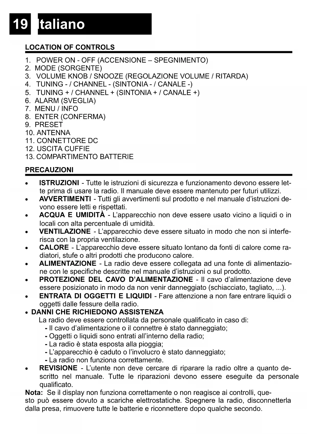 La radio deve essere controllata da personale qualificato in caso di: - Il cavo d’alimentazione o il connettre è stato danneggiato; - Oggetti o liquidi sono entrati all’interno della radio; - La radio è stata esposta alla pioggia; - L’apparecchio è caduto o l’involucro è stato danneggiato; - La radio non funziona correttamente. REVISIONE - L’utente non deve cercare di riparare la radio oltre a quanto de- scritto nel manuale. Tutte le riparazioni devono essere eseguite da personale qualificato. Nota: Se il display non funziona correttamente o non reagisce ai controlli, que- sto può essere dovuto a scariche elettrostatiche. Spegnere la radio, disconnetterla dalla presa, rimuovere tutte le batterie e riconnettere dopo qualche secondo.20 Italiano