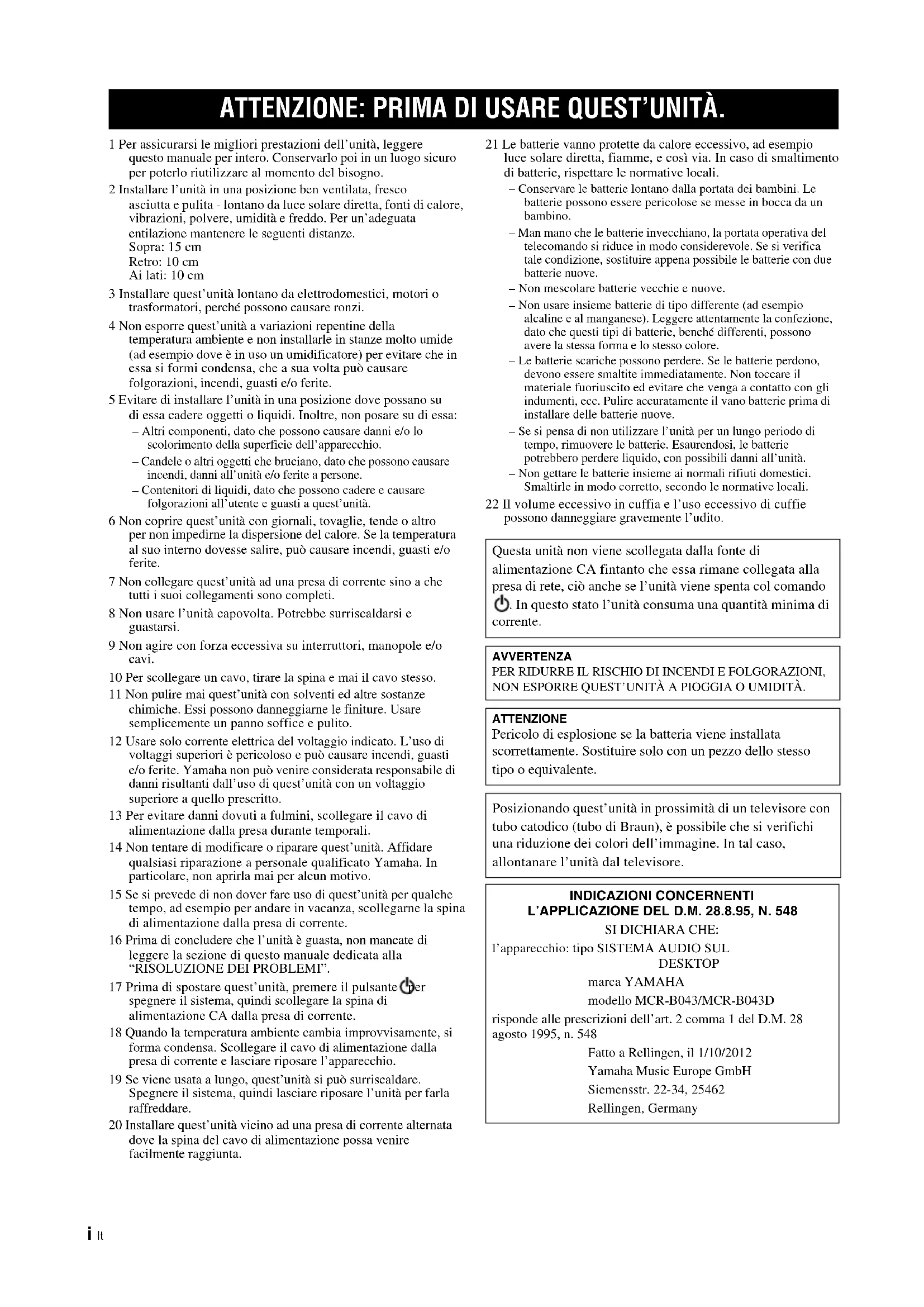 - La banda di 2,4 GHz utilizzata dai dispositivi compatibili Bluetooth è una banda radio condivisa da molti tipi di apparecchiature. Mentre i dispositivi compatibili Bluetooth utilizzano una tecnologia che riduce l’influenza di altri componenti che utilizzano la stessa banda radio, tale influenza può ridurre la velocità o la distanza di comunicazione e, in alcuni casi, interrompere le comunicazioni.• La velocità di trasferimento del segnale e la distanza alla quale la comunicazione è possibile varia a seconda della distanza tra i dispositivi comunicanti, della presenza di ostacoli, delle condizioni delle onde radio e del tipo di apparecchiatura.• Yamaha non fornisce alcuna garanzia in merito ai collegamenti wireless tra l’unità e i dispositivi compatibili con la funzione Bluetooth. DATI TECNICI Yamaha Music Europe GmbH dichiara con il presente che questa unità è conforme ai requisiti essenziali e alle normative pertinenti della direttiva 1999/5/CE.Yamaha Music Europe GmbHSiemensstr. 22-34 25462 Rellingen, GermanyTel: +49-4101-303-027 It Italiano Informazioni per gli utenti sulla raccolta e lo smaltimento di vecchia attrezzatura e batterie usate Questi simboli sui prodotti, sull’imballaggio, e/o sui documenti che li accompagnano significano che i prodotti e le batterie elettriche e elettroniche non dovrebbero essere mischiati con i rifiuti domestici generici. Per il trattamento, recupero e riciclaggio appropriati di vecchi prodotti e batterie usate, li porti, prego, ai punti di raccolta appropriati, in accordo con la Sua legislazione nazionale e le direttive 2002/96/CE e 2006/66/CE. Smaltendo correttamente questi prodotti e batterie, Lei aiuterà a salvare risorse preziose e a prevenire alcuni potenziali effetti negativi sulla salute umana e l’ambiente, che altrimenti potrebbero sorgere dal trattamento improprio dei rifiuti. Per ulteriori informazioni sulla raccolta e il riciclaggio di vecchi prodotti e batterie, prego contatti la Sua amministrazione comunale locale, il Suo servizio di smaltimento dei rifiuti o il punto vendita dove Lei ha acquistato gli articoli. [Informazioni sullo smaltimento negli altri Paesi al di fuori dell’Unione europea] Questi simboli sono validi solamente nell’Unione europea. Se Lei desidera disfarsi di questi articoli, prego contatti le Sue autorità locali o il rivenditore e richieda la corretta modalità di smaltimento. Noti per il simbolo della batteria (sul fondo due esempi di simbolo): È probabile che questo simbolo sia usato in combinazione con un simbolo chimico. In questo caso è conforme al requisito stabilito dalla direttiva per gli elementi chimici contenuti. In caso di macchie di colore o disturbi nell’utilizzo in prossimità di un televisore, allontanare l’unità dal televisore quando è in uso. Non utilizzare l’unità entro 22 cm dalle persone con pacemaker cardiaco o un defibrillatore impiantato. Le onde radio potrebbero interferire con gli apparecchi elettromedicali. Non utilizzare l’unità vicino ad apparecchi medici o all’interno di strutture mediche. L’utente non deve eseguire reverse engineering, decompilare, alterare, tradurre o smontare il software utilizzato in questa unità, sia in parte che nella sua totalità. Gli utenti aziendali, sia impiegati dell’azienda stessa che partner in affari, dovranno osservare gli accordi contrattuali contenuti in questa clausola. Se quanto stipulato in questa clausola e in questo contratto non potesse essere osservato, l’utente dovrà immediatamente interrompere l’utilizzo di questo software. LASER Tipo Laser semiconduttore GaAs/GaAlAs Lunghezza d’onda 790 nm Potenza di uscita 7 mW ATTENZIONE L’uso di controlli, regolazioni, operazioni o procedure non specificati in questo manuale possono risultare in esposizione a radiazioni pericolose.i Es 1 Para asegurar el mejor rendimiento de este aparato, lea atentamente este manual. Y luego guárdelo en un lugar seguro para poder consultarlo en el futuro en caso de ser necesario. 2 Instale esta unidad en un lugar bien ventilado, fresco, seco y limpio, alejado de la luz directa del sol, fuentes de calor, vibración, polvo, humedad y frío. Para una adecuada ventilación, permita que el equipo tenga el siguiente espacio libre mínimo: Arriba: 15 cm Atrás: 10 cm A los lados: 10 cm 3 Coloque este aparato lejos de otros aparatos eléctricos, motores o transformadores, para evitar así los ruidos de zumbido. 4 No exponga este aparato a cambios bruscos de temperaturas, del frío al calor, ni lo coloque en lugares muy húmedos (una habitación con deshumidificador, por ejemplo), para impedir así que se forme condensación en su interior, lo que podría causar una descarga eléctrica, un incendio, daños en el aparato y/o lesiones a las personas. 5 Evite instalar este aparato en un lugar donde puedan caerle encima objetos extraños y/o donde quede expuesto al goteo o a la salpicadura de líquidos. Encima de este aparato no ponga: – Otros componentes, porque pueden causar daños y/o decoloración en la superficie de este aparato. – Objetos con fuego (velas, por ejemplo), porque pueden causar un incendio, daños en el aparato y/o lesiones a las personas. – Recipientes con líquidos, porque pueden caerse y derramar el líquido, causando descargas eléctricas al usuario y/o dañando el aparato. 6 No tape este aparato con un periódico, mantel, cortina, etc. para no impedir el escape del calor. Si aumenta la temperatura en el interior del aparato, esto puede causar un incendio, daños en el aparato y/o lesiones a las personas. 7 No enchufe este aparato a una toma de corriente hasta después de haber terminado todas las conexiones. 8 No ponga el aparato al revés. Podría recalentarse y posiblemente causar daños. 9 No utilice una fuerza excesiva con los conmutadores, los controles y/o los cables. 10 Cuando desconecte el cable de alimentación de la toma de corriente, sujete la clavija y tire de ella; no tire del propio cable