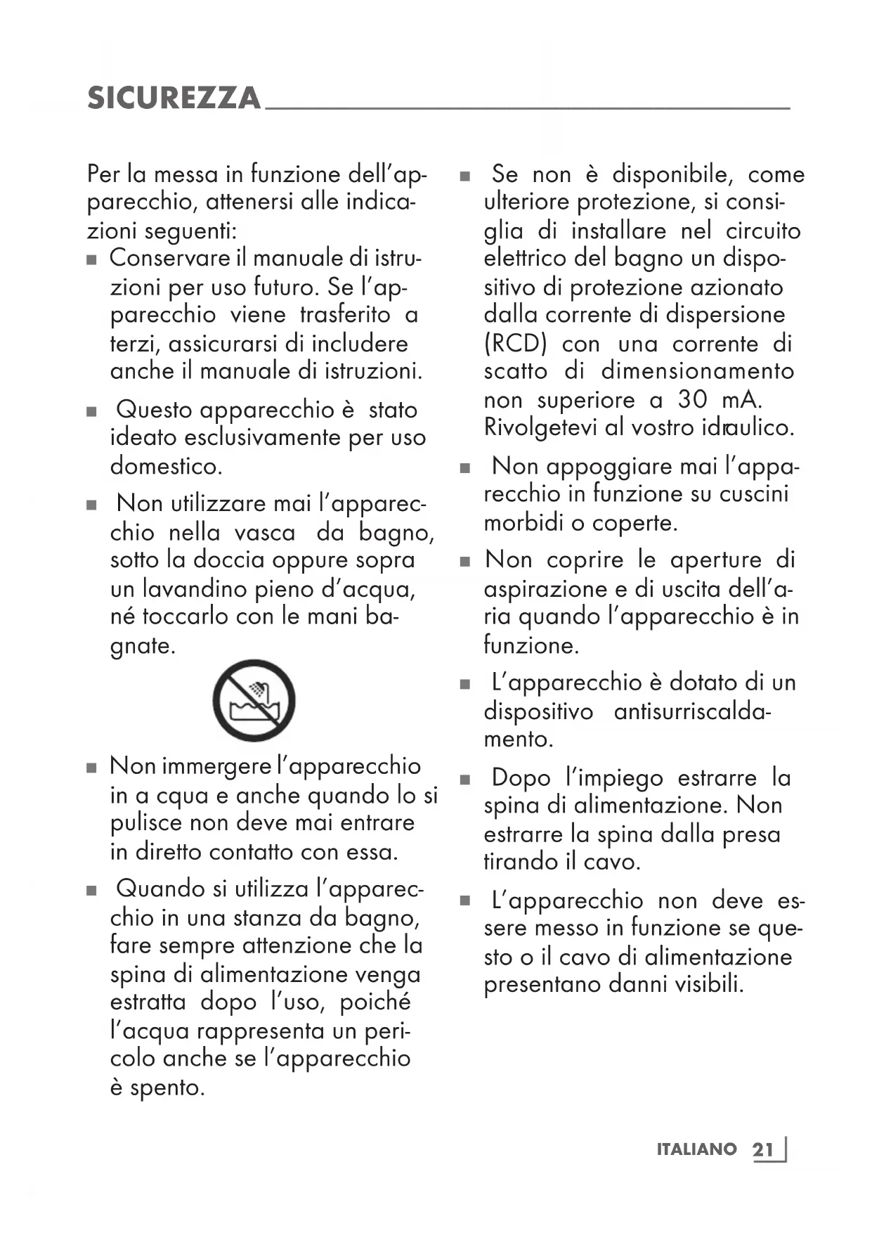 L’apparecchio non deve es- sere messo in funzione se que- sto o il cavo di alimentazione presentano danni visibili. ITALIANO 21SICUREZZA