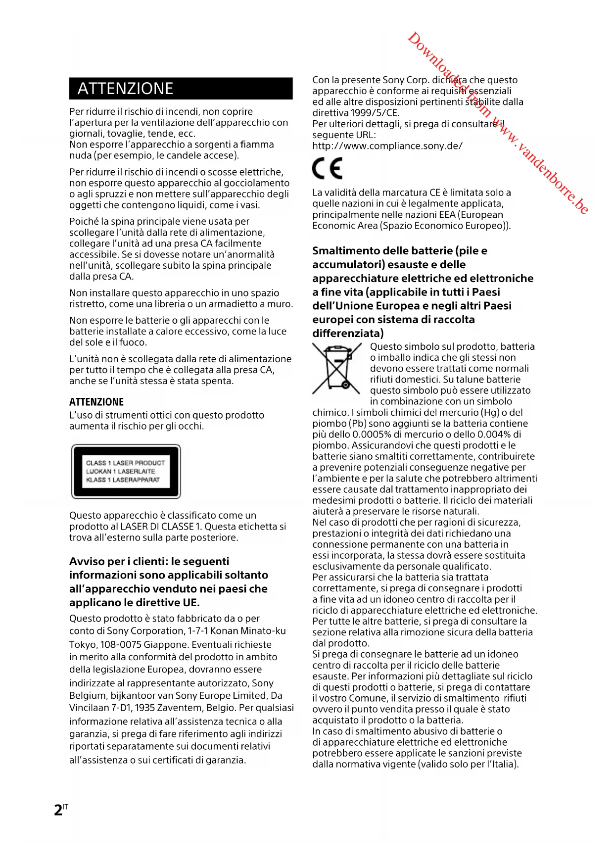 CMT-SBT20 4-583-746-31(2) ATTENZIONE Per ridurre il rischio di incendi, non coprire l’apertura per la ventilazione dell’apparecchio con giornali, tovaglie, tende, ecc. Non esporre l’apparecchio a sorgenti a fiamma nuda (per esempio, le candele accese). Per ridurre il rischio di incendi o scosse elettriche, non esporre questo apparecchio al gocciolamento o agli spruzzi e non mettere sull’apparecchio degli oggetti che contengono liquidi, come i vasi. Poiché la spina principale viene usata per scollegare l’unità dalla rete di alimentazione, collegare l’unità ad una presa CA facilmente accessibile. Se si dovesse notare un’anormalità nell’unità, scollegare subito la spina principale dalla presa CA. Non installare questo apparecchio in uno spazio ristretto, come una libreria o un armadietto a muro. Non esporre le batterie o gli apparecchi con le batterie installate a calore eccessivo, come la luce del sole e il fuoco. L’unità non è scollegata dalla rete di alimentazione per tutto il tempo che è collegata alla presa CA, anche se l’unità stessa è stata spenta. ATTENZIONE L’uso di strumenti ottici con questo prodotto aumenta il rischio per gli occhi. Questo apparecchio è classificato come un prodotto al LASER DI CLASSE 1. Questa etichetta si trova all’esterno sulla parte posteriore. Avviso per i clienti: le seguenti informazioni sono applicabili soltanto all’apparecchio venduto nei paesi che applicano le direttive UE. Questo prodotto è stato fabbricato da o per conto di Sony Corporation, 1-7-1 Konan Minato-ku Tokyo, 108-0075 Giappone. Eventuali richieste in merito alla conformità del prodotto in ambito della legislazione Europea, dovranno essere indirizzate al rappresentante autorizzato, Sony Belgium, bijkantoor van Sony Europe Limited, Da Vincilaan 7-D1, 1935 Zaventem, Belgio. Per qualsiasi informazione relativa all’assistenza tecnica o alla garanzia, si prega di fare riferimento agli indirizzi riportati separatamente sui documenti relativi all’assistenza o sui certificati di garanzia. Con la presente Sony Corp. dichiara che questo apparecchio è conforme ai requisiti essenziali ed alle altre disposizioni pertinenti stabilite dalla direttiva 1999/5/CE. Per ulteriori dettagli, si prega di consultare il seguente URL: http://www.compliance.sony.de/ La validità della marcatura CE è limitata solo a quelle nazioni in cui è legalmente applicata, principalmente nelle nazioni EEA (European Economic Area (Spazio Economico Europeo)). Smaltimento delle batterie (pile e accumulatori) esauste e delle apparecchiature elettriche ed elettroniche a fine vita (applicabile in tutti i Paesi dell’Unione Europea e negli altri Paesi europei con sistema di raccolta differenziata) Questo simbolo sul prodotto, batteria o imballo indica che gli stessi non devono essere trattati come normali rifiuti domestici. Su talune batterie questo simbolo può essere utilizzato in combinazione con un simbolo chimico. I simboli chimici del mercurio (Hg) o del piombo (Pb) sono aggiunti se la batteria contiene più dello 0.0005% di mercurio o dello 0.004% di piombo. Assicurandovi che questi prodotti e le batterie siano smaltiti correttamente, contribuirete a prevenire potenziali conseguenze negative per l’ambiente e per la salute che potrebbero altrimenti essere causate dal trattamento inappropriato dei medesimi prodotti o batterie. Il riciclo dei materiali aiuterà a preservare le risorse naturali. Nel caso di prodotti che per ragioni di sicurezza, prestazioni o integrità dei dati richiedano una connessione permanente con una batteria in essi incorporata, la stessa dovrà essere sostituita esclusivamente da personale qualificato. Per assicurarsi che la batteria sia trattata correttamente, si prega di consegnare i prodotti a fine vita ad un idoneo centro di raccolta per il riciclo di apparecchiature elettriche ed elettroniche. Per tutte le altre batterie, si prega di consultare la sezione relativa alla rimozione sicura della batteria dal prodotto. Si prega di consegnare le batterie ad un idoneo centro di raccolta per il riciclo delle batterie esauste. Per informazioni più dettagliate sul riciclo di questi prodotti o batterie, si prega di contattare il vostro Comune, il servizio di smaltimento rifiuti ovvero il punto vendita presso il quale è stato acquistato il prodotto o la batteria. In caso di smaltimento abusivo di batterie o di apparecchiature elettriche ed elettroniche potrebbero essere applicate le sanzioni previste dalla normativa vigente (valido solo per l’Italia). Downloaded from www.vandenborre.be3