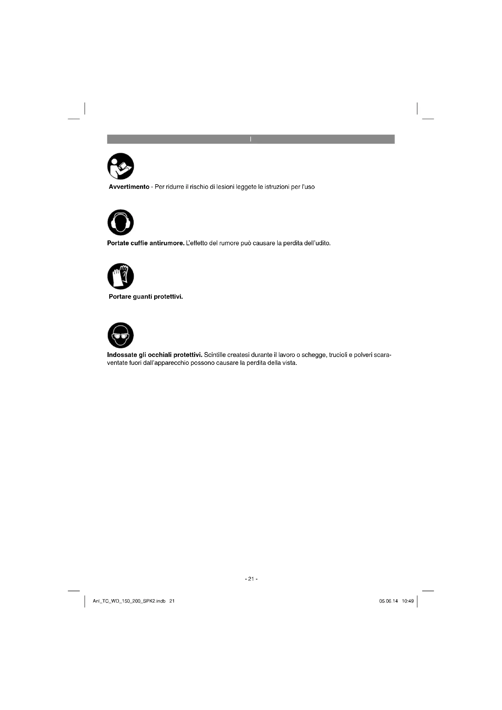 Avvertimento - Per ridurre il rischio di lesioni leggete le istruzioni per l’uso Portate cuffi e antirumore. L’ e ff etto del rumore può causare la perdita dell’udito. Indossate gli occhiali protettivi. Scintille createsi durante il lavoro o schegge, trucioli e polveri scara- ventate fuori dall’apparecchio possono causare la perdita della vista. Portare guanti protettivi. Anl_TC_WD_150_200_SPK2.indb 21Anl_TC_WD_150_200_SPK2.indb 21 05.06.14 10:4905.06.14 10:49I
