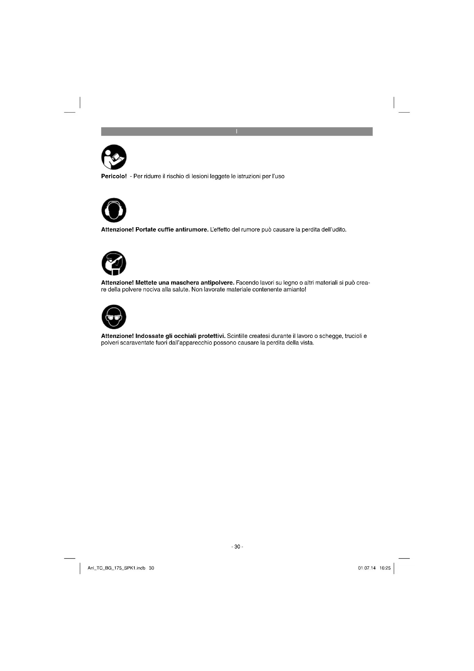 Pericolo! - Per ridurre il rischio di lesioni leggete le istruzioni per l’uso Attenzione! Portate cuffi e antirumore. L’e ff etto del rumore può causare la perdita dell’udito. Attenzione! Indossate gli occhiali protettivi. Scintille createsi durante il lavoro o schegge, trucioli e polveri scaraventate fuori dall’apparecchio possono causare la perdita della vista. Attenzione! Mettete una maschera antipolvere. Facendo lavori su legno o altri materiali si può crea- re della polvere nociva alla salute. Non lavorate materiale contenente amianto! Anl_TC_BG_175_SPK1.indb 30Anl_TC_BG_175_SPK1.indb 30 01.07.14 16:2501.07.14 16:25I