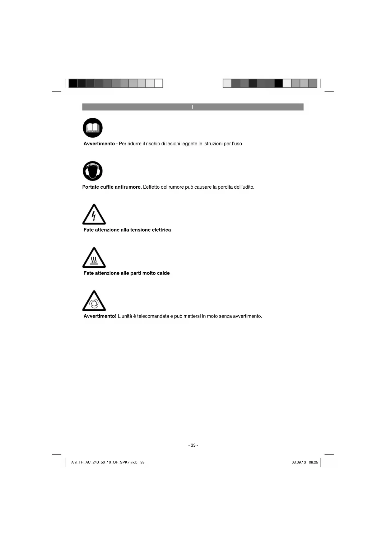 Fate attenzione alla tensione elettrica Fate attenzione alle parti molto calde Avvertimento! L’unità è telecomandata e può mettersi in moto senza avvertimento. Avvertimento - Per ridurre il rischio di lesioni leggete le istruzioni per l’uso Portate cuffi e antirumore. L’e ff etto del rumore può causare la perdita dell’udito. Anl_TH_AC_240_50_10_OF_SPK7.indb 33Anl_TH_AC_240_50_10_OF_SPK7.indb 33 03.09.13 08:2503.09.13 08:25I