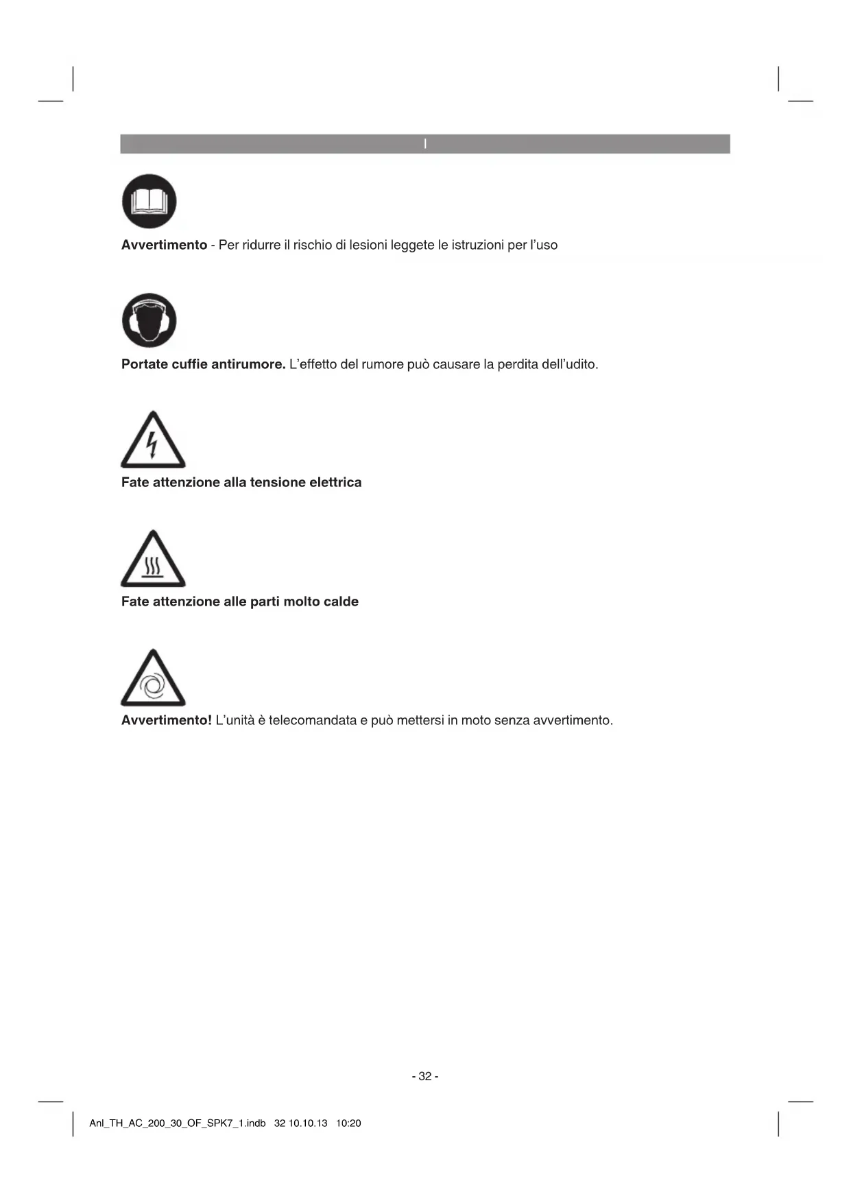 Fate attenzione alla tensione elettrica Fate attenzione alle parti molto calde Avvertimento! L’unità è telecomandata e può mettersi in moto senza avvertimento. Avvertimento - Per ridurre il rischio di lesioni leggete le istruzioni per l’uso Portate cue antirumore. L’eetto del rumore può causare la perdita dell’udito.