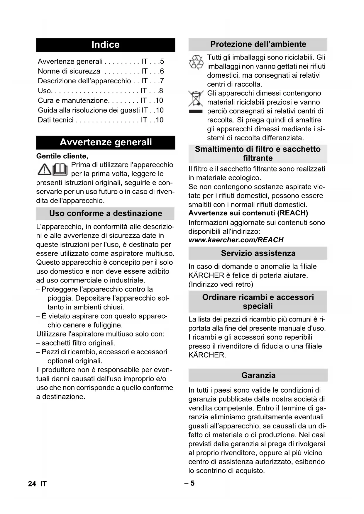 - Puissance P nom 1000 W Protection du réseau (à action retardée) 10 A Volume de la cuve 20 l Arrivée d'eau avec poi- gnée 12 l Arrivée d'eau avec buse de sol 10 l Câble d’alimentation H05VV-F 2x0,75 Niveau de pression acous- tique (EN 60704-2-1) 72 dB(A) Poids (sans accessoire) MV 4 7,0 kg Poids (sans accessoire) MV 4 Premium 7,3 kg 23FR– 5 Gentile cliente, Prima di utilizzare l'apparecchio per la prima volta, leggere le presenti istruzioni originali, seguirle e con- servarle per un uso futuro o in caso di riven- dita dell'apparecchio. L'apparecchio, in conformità alle descrizio- ni e alle avvertenze di sicurezza date in queste istruzioni per l'uso, è destinato per essere utilizzato come aspiratore multiuso. Questo apparecchio è concepito per il solo uso domestico e non deve essere adibito ad uso commerciale o industriale. – Proteggere l'apparecchio contro la pioggia. Depositare l'apparecchio sol- tanto in ambienti chiusi. – È vietato aspirare con questo apparec- chio cenere e fuliggine. Utilizzare l'aspiratore multiuso solo con: – sacchetti filtro originali. – Pezzi di ricambio, accessori e accessori optional originali. Il produttore non è responsabile per even- tuali danni causati dall'uso improprio e/o uso che non corrisponde a quello conforme a destinazione. Tutti gli imballaggi sono riciclabili. Gli imballaggi non vanno gettati nei rifiuti domestici, ma consegnati ai relativi centri di raccolta. Gli apparecchi dimessi contengono materiali riciclabili preziosi e vanno perciò consegnati ai relativi centri di raccolta. Si prega quindi di smaltire gli apparecchi dimessi mediante i si- stemi di raccolta differenziata. Il filtro e il sacchetto filtrante sono realizzati in materiale ecologico. Se non contengono sostanze aspirate vie- tate per i rifiuti domestici, possono essere smaltiti con i normali rifiuti domestici. Avvertenze sui contenuti (REACH) Informazioni aggiornate sui contenuti sono disponibili all'indirizzo: www.kaercher.com/REACH In caso di domande o anomalie la filiale KÄRCHER è felice di poterla aiutare. (Indirizzo vedi retro) La lista dei pezzi di ricambio più comuni è ri- portata alla fine del presente manuale d'uso. I ricambi e gli accessori sono reperibili presso il rivenditore di fiducia o una filiale KÄRCHER. In tutti i paesi sono valide le condizioni di garanzia pubblicate dalla nostra società di vendita competente. Entro il termine di ga- ranzia eliminiamo gratuitamente eventuali guasti all’apparecchio, se causati da un di- fetto di materiale o di produzione. Nei casi previsti dalla garanzia si prega di rivolgersi al proprio rivenditore, oppure al più vicino centro di assistenza autorizzato, esibendo lo scontrino di acquisto. Indice Avvertenze generali