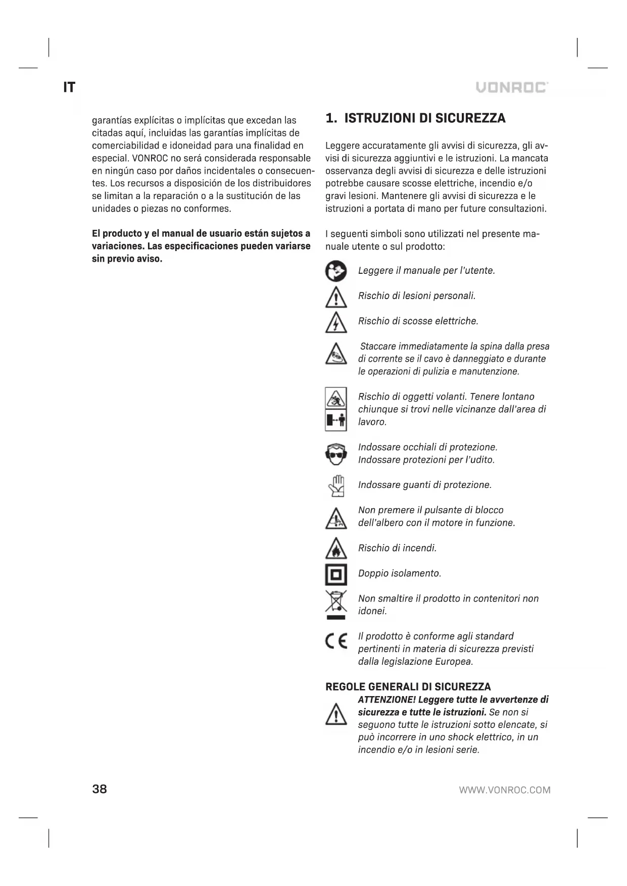 presente documento, ivi comprese le garanzie im- plicite di commerciabilità e idoneità per uno scopo particolare. In nessun caso VONROC sarà responsa- bile di eventuali danni incidentali o consequenziali. I rimedi dei rivenditori saranno limitati alla ripara- zione o sostituzione di unità o parti non conformi. Il prodotto e il manuale per l’utente sono soggetti a modifiche. I dati tecnici possono essere modificati senza ulteriore notifica.