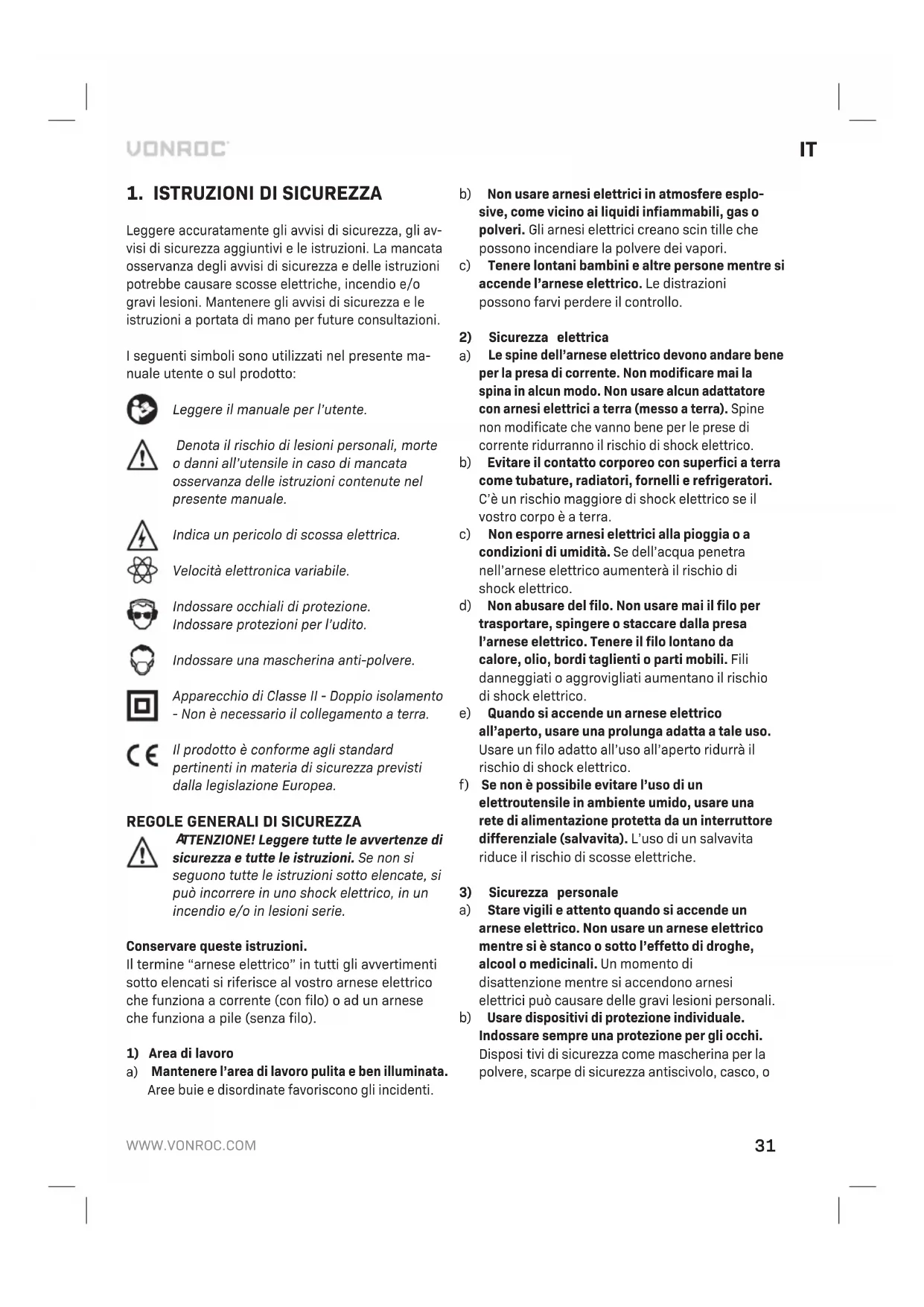 Sono state utilizzate parti di ricambio non originali Ciò costituisce l’unica garanzia espressa o implicita fornita dall’azienda. Non esistono altre garanzie es- presse o implicite che si estendono oltre il presente documento, ivi comprese le garanzie implicite di commerciabilità e idoneità per uno scopo particola- re. In nessun caso VONROC sarà responsabile di eventuali danni incidentali o consequenziali. I rime- di dei rivenditori saranno limitati alla riparazione o sostituzione di unità o parti non conformi. Il prodotto e il manuale per l’utente sono soggetti a modifi che. I dati tecnici possono essere modifi cati senza ulteriore notifi ca.