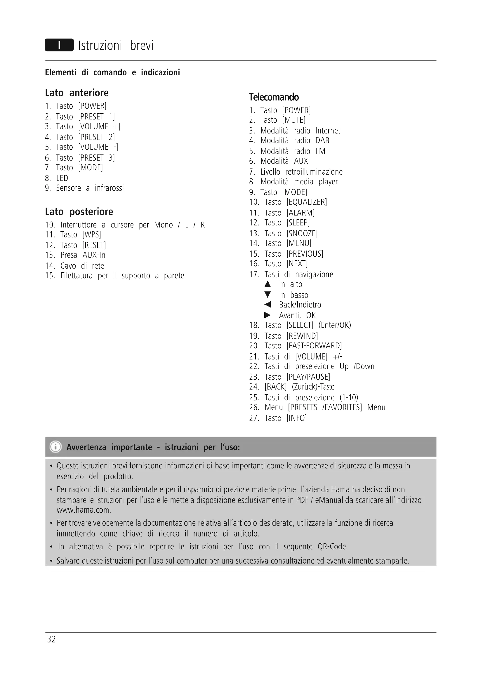 Scarica le istruzioni per il tuo Radio in formato PDF gratuitamente! Trova il tuo manuale IR80MBT - HAMA e riprendi in mano il tuo dispositivo elettronico. In questa pagina sono pubblicati tutti i documenti necessari per l'utilizzo del tuo dispositivo. IR80MBT del marchio HAMA.