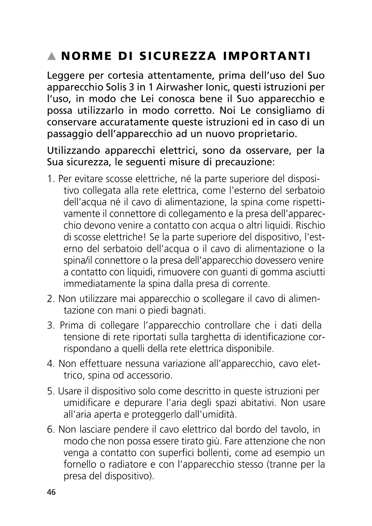 Leggere per cortesia attentamente, prima dell’uso del Suo apparecchio Solis 3 in 1 Airwasher Ionic, questi istruzioni per l’uso, in modo che Lei conosca bene il Suo apparecchio e possa utilizzarlo in modo corretto. Noi Le consigliamo di conservare accuratamente queste istruzioni ed in caso di un passaggio dell’apparecchio ad un nuovo proprietario. Utilizzando apparecchi elettrici, sono da osservare, per la Sua sicurezza, le seguenti misure di precauzione: