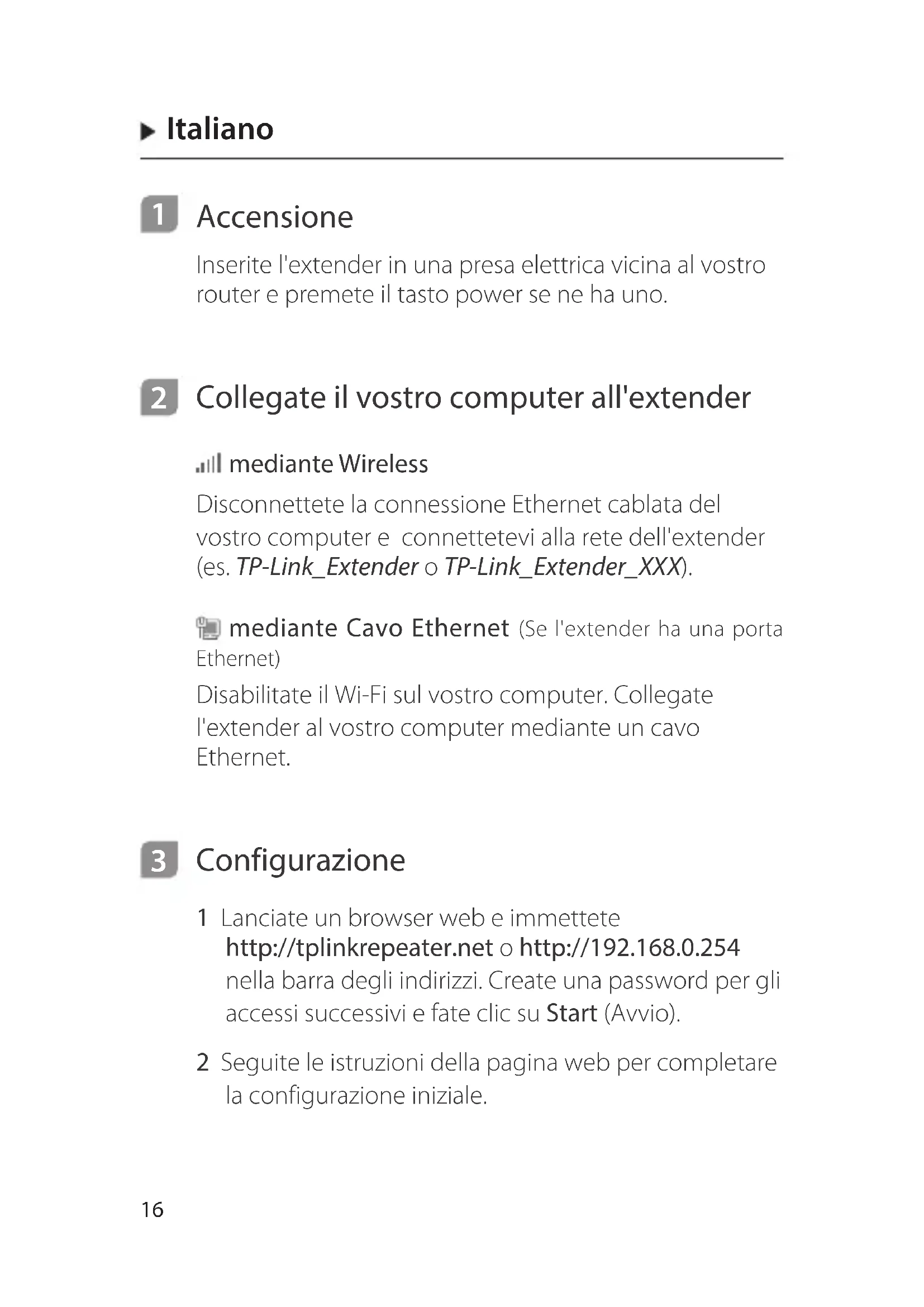 Configurazione 1 Lanciate un browser web e immettete http://tplinkrepeater.net o http://192.168.0.254 nella barra degli indirizzi. Create una password per gli accessi successivi e fate clic su Start (Avvio). 2 Seguite le istruzioni della pagina web per completare la configurazione iniziale.Italiano