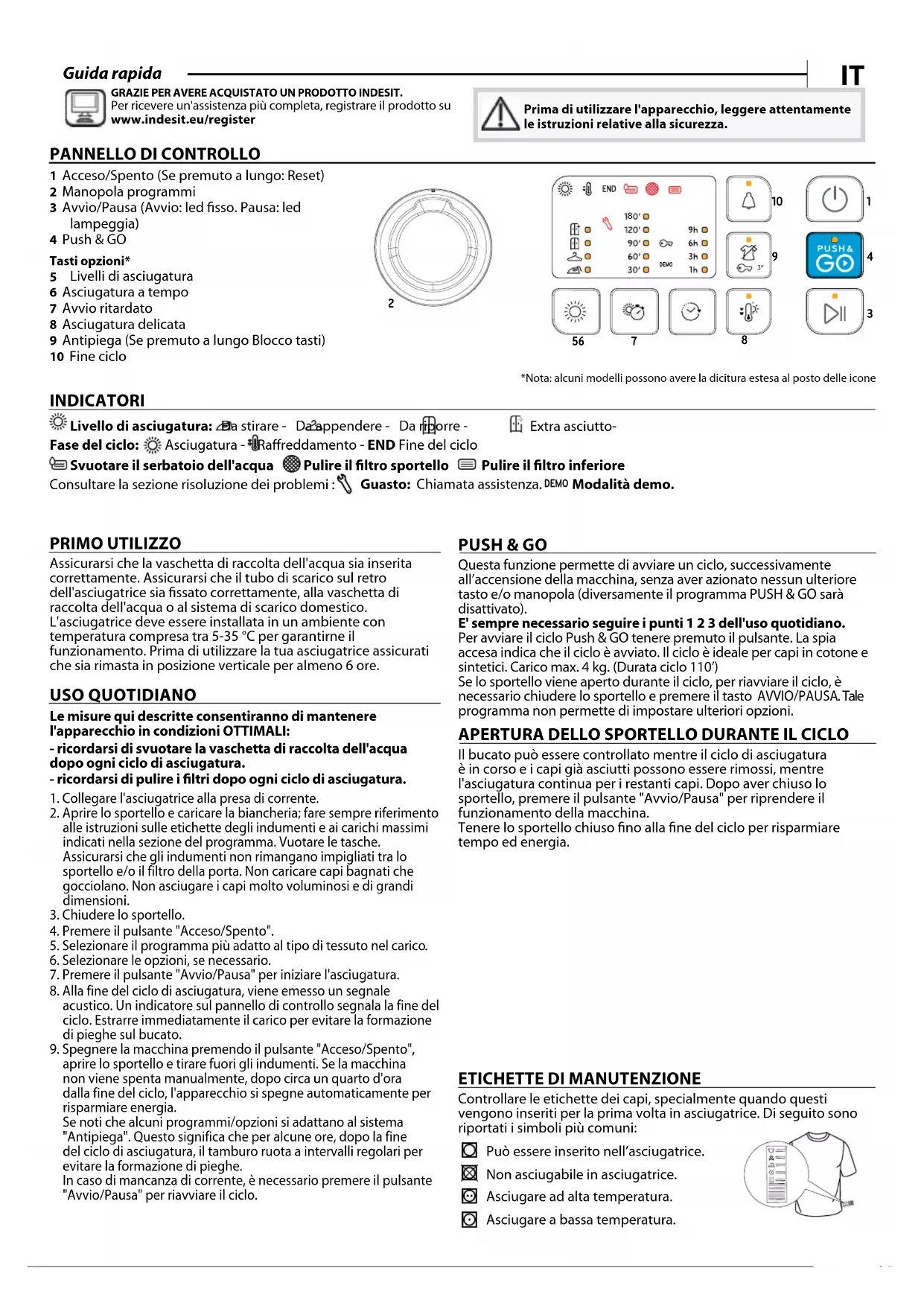 Rimuovere il filtro porta e posizionare la rastrelliera. I lacci devono essere infilati all'interno delle scarpe: punte rivolte verso il basso e le suole davanti. Non aggiungere biancheria o altre scarpe dentro il cesto. Riposizionare il filtro porta al termine dell'asciugatura. PROGRAMMI La durata di questi programmi dipende dall’entità del carico, dal tipo di tessuti, dalla velocità della centrifuga usata sulla vostra lavatrice e da altre ulteriori opzioni selezionate. Nei modelli con display la durata dei cicli viene mostrata nel pannello di controllo. Il tempo residuo viene costantemente monitorato e modificato durante il ciclo di asciugatura per mostrare la miglior stima possibile. Opzione per l’uso: se tutti i carichi dei Cicli Automatici risultano consistentemente meno o più asciutti di quanto desiderato, è possibile aumentare o diminuire il livello di asciugatura utilizzando l'opzione specifica. Eco kg Max* Tempo 195' Questo è il programma più efficiente in termini di consumo di energia per asciugare biancheria di cotone. I valori riportati sull'etichetta energetica si riferiscono a questo programma. NOTA: Per un'efficienza energetica ottimale, questo ciclo è impostato di default sul livello "Da riporre". Per un'asciugatura più intensa suggeriamo di usare il ciclo Cotone. Cotone kg Max* Tempo 190' Ciclo adatto ad asciugare tutti i tipi di cotone, pronto per essere messo nell'armadio. Misti kg 4 Tempo 140' Questo programma è ideale per asciugare insieme tessuti di cotone e sintetici. Sintetici kg 4 Tempo 75' Per asciugare biancheria in fibre sintetiche. Mini sintetici kg 2 Tempo 65' Asciugatura economica di carichi ridotti. Delicati kg 2 Tempo 80' Per asciugare biancheria che richiede un trattamento delicato. Lana kg 1 Tempo 115' Per asciugare capi in lana. Si consiglia di rivoltare i capi prima dell'asciugatura. Lasciare asciugare naturalmente i bordi più pesanti che risultassero ancora umidi. Refresh Programma breve adatto a rinfrescare fibre e capi attraverso l’emissione di aria fresca. Non utilizzare con capi ancora bagnati. Può essere utilizzato su qualsiasi dimensione di carico, ma è più efficace sui piccoli carichi. Il ciclo dura circa 20 minuti. Jeans kg 3 Tempo 130' Per asciugare jeans e indumenti di cotone resistente, tipo denim, ad esempio pantaloni e giubbetti. Piumone Tempo 180' Per asciugare capi voluminosi come un singolo piumone. Baby kg 2 Tempo 125' Un programma appositamente studiato per asciugare indumenti e la biancheria dei neonati (cotone e ciniglia) e capi delicati. Non asciugare articoli con rivestimenti in plastica Camicie kg 3 Tempo 140' Questo programma è dedicato alle camicie realizzate in cotone o misto cotone/sintetici Sport kg 4 Tempo 95' Per asciugare indumenti sportivi sintetici o di misto cotone. Scarpe da ginnastica1 paio Tempo 100' Questo è un programma per asciugare un paio di scarpe sportive. Le scarpe devono essere state lavate e centrifugate ad una velocità di centrifuga minima di 400 giri. Devono essere usate con l’apposita rastrelliera per scarpe fornita. Asciugare solo scarpe fatte di materiale sintetico o tela. 45’ Rapido 45' kg 1 Un programma rapido a tempo, ideale per asciugare capi centrifugati ad alta velocità in lavatrice, ad esempio le camicie utilizzate in una settimana lavorativa.GRAZIE PER AVERE ACQUISTATO UN PRODOTTO INDESIT. Per ricevere un'assistenza più completa, registrare il prodotto su www.indesit.eu/register Documentazione normativa, documentazione standard, ordinazione di pezzi di ricambio e altre informazioni sul prodotto possono essere reperite: