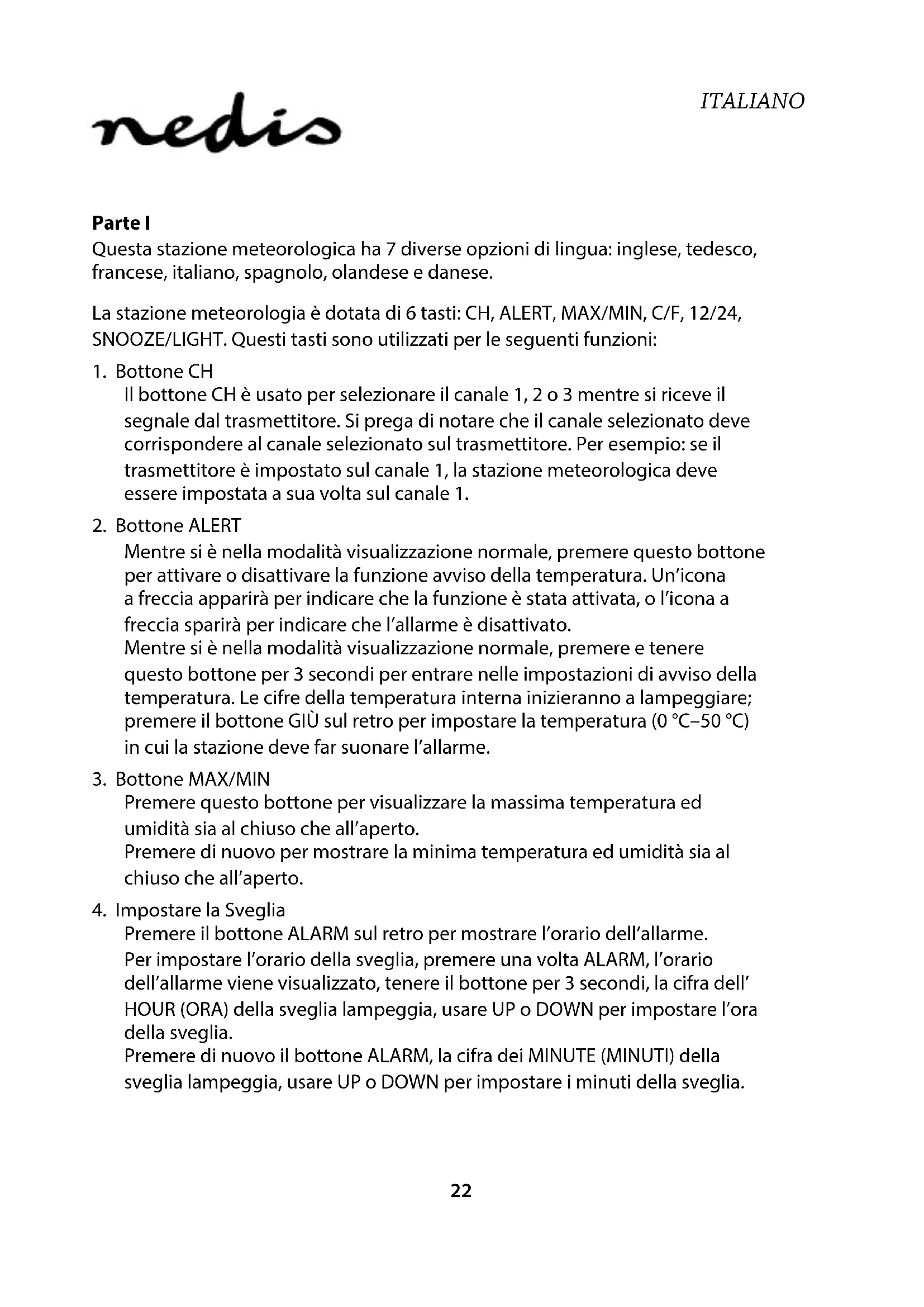 Parte I Questa stazione meteorologica ha 7 diverse opzioni di lingua: inglese, tedesco, francese, italiano, spagnolo, olandese e danese. La stazione meteorologia è dotata di 6 tasti: CH, ALERT, MAX/MIN, C/F, 12/24, SNOOZE/LIGHT. Questi tasti sono utilizzati per le seguenti funzioni: