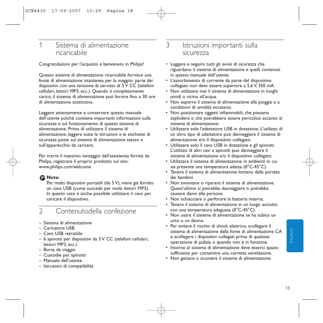 17-09-2007 13:29 Pagina 18 Sistema di alimentazione ricaricabile Congratulazioni per l’acquisto e benvenuto in Philips! Questo sistema di alimentazione ricaricabile fornisce una fonte di alimentazione istantanea per la maggior parte dei dispositivi con una tensione di servizio di 5 V CC (telefoni cellulari, lettori MP3, ecc.). Quando è completamente carico, il sistema di alimentazione può fornire fino a 30 ore di alimentazione sostitutiva. Leggere attentamente e conservare questo manuale dell’utente poiché contiene importanti informazioni sulla sicurezza e sul funzionamento di questo sistema di alimentazione. Prima di utilizzare il sistema di alimentazione, leggere tutte le istruzioni e le etichette di sicurezza poste sul sistema di alimentazione stesso e sull’apparecchio da caricare. Per trarre il massimo vantaggio dall’assistenza fornita da Philips, registrare il proprio prodotto sul sito: www.philips.com/welcome Nota: Per molti dispositivi portatili (da 5 V), viene già fornito un cavo USB (come succede per molti lettori MP3). In questo caso è anche possibile utilizzare il cavo per caricare il dispositivo.
