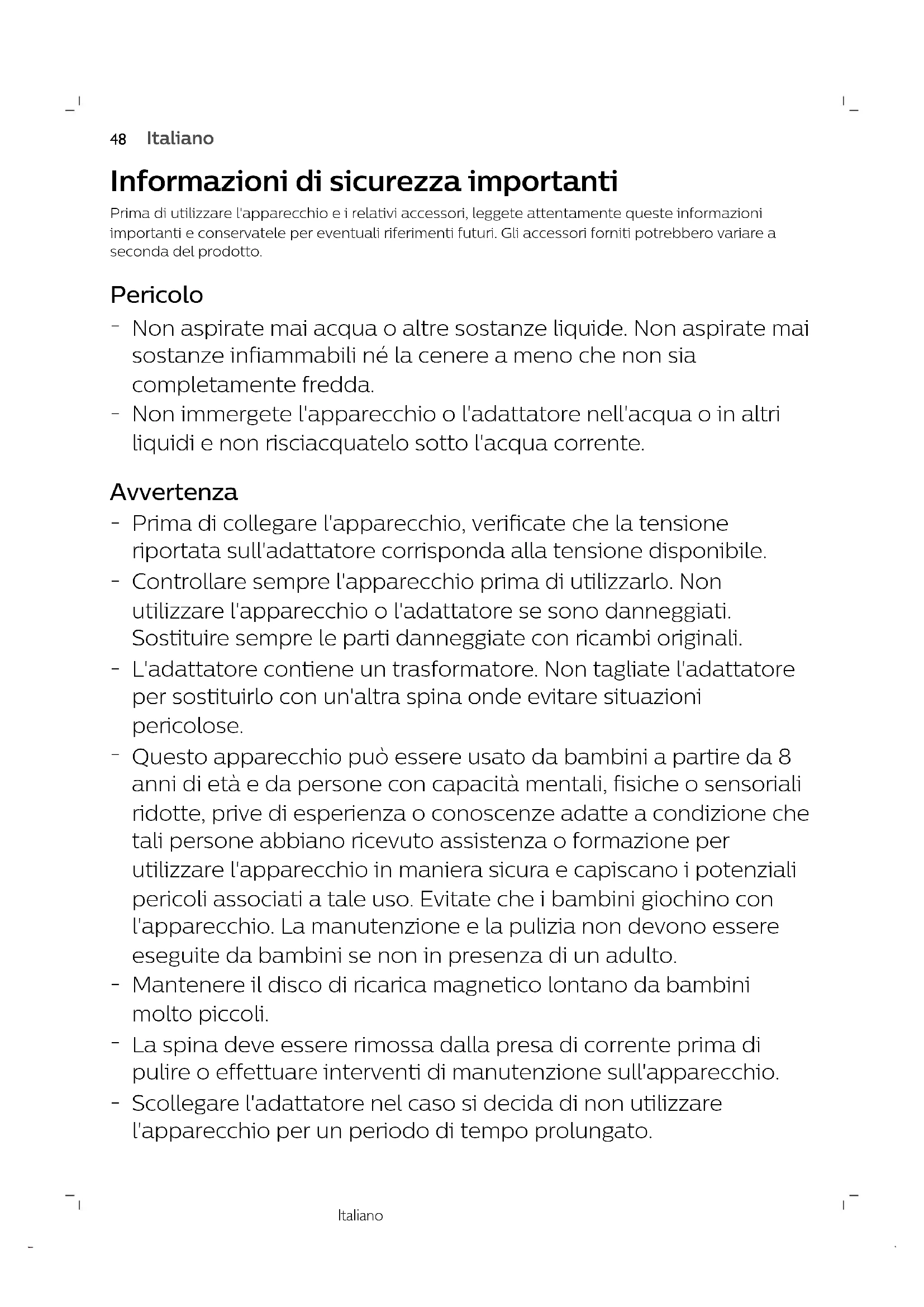 Questo apparecchio può essere usato da bambini a partire da 8 anni di età e da persone con capacità mentali, fisiche o sensoriali ridotte, prive di esperienza o conoscenze adatte a condizione che tali persone abbiano ricevuto assistenza o formazione per utilizzare l'apparecchio in maniera sicura e capiscano i potenziali pericoli associati a tale uso. Evitate che i bambini giochino con l'apparecchio. La manutenzione e la pulizia non devono essere eseguite da bambini se non in presenza di un adulto.