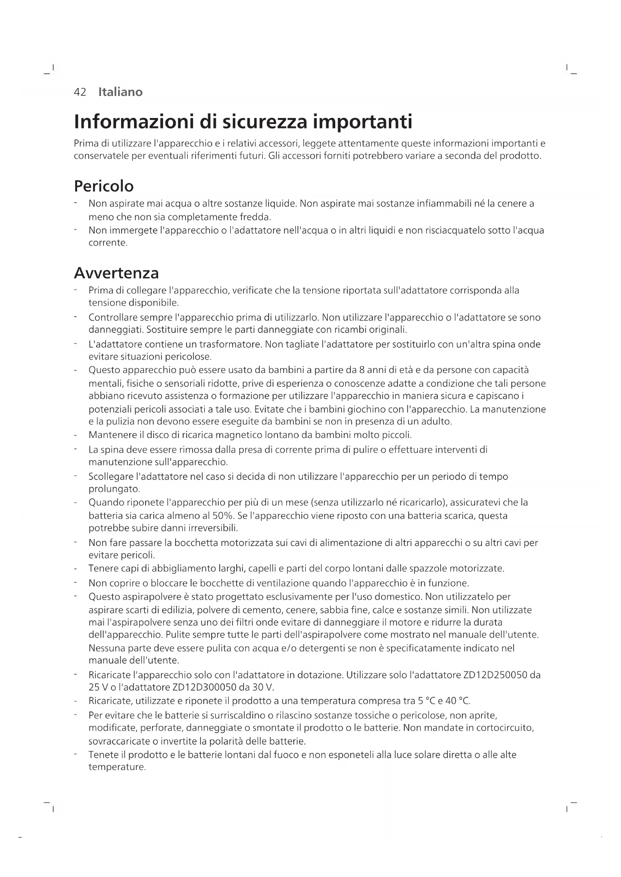 Italiano Informazioni di sicurezza importanti Prima di utilizzare l'apparecchio e i relativi accessori, leggete attentamente queste informazioni importanti e conservatele per eventuali riferimenti futuri. Gli accessori forniti potrebbero variare a seconda del prodotto. Pericolo